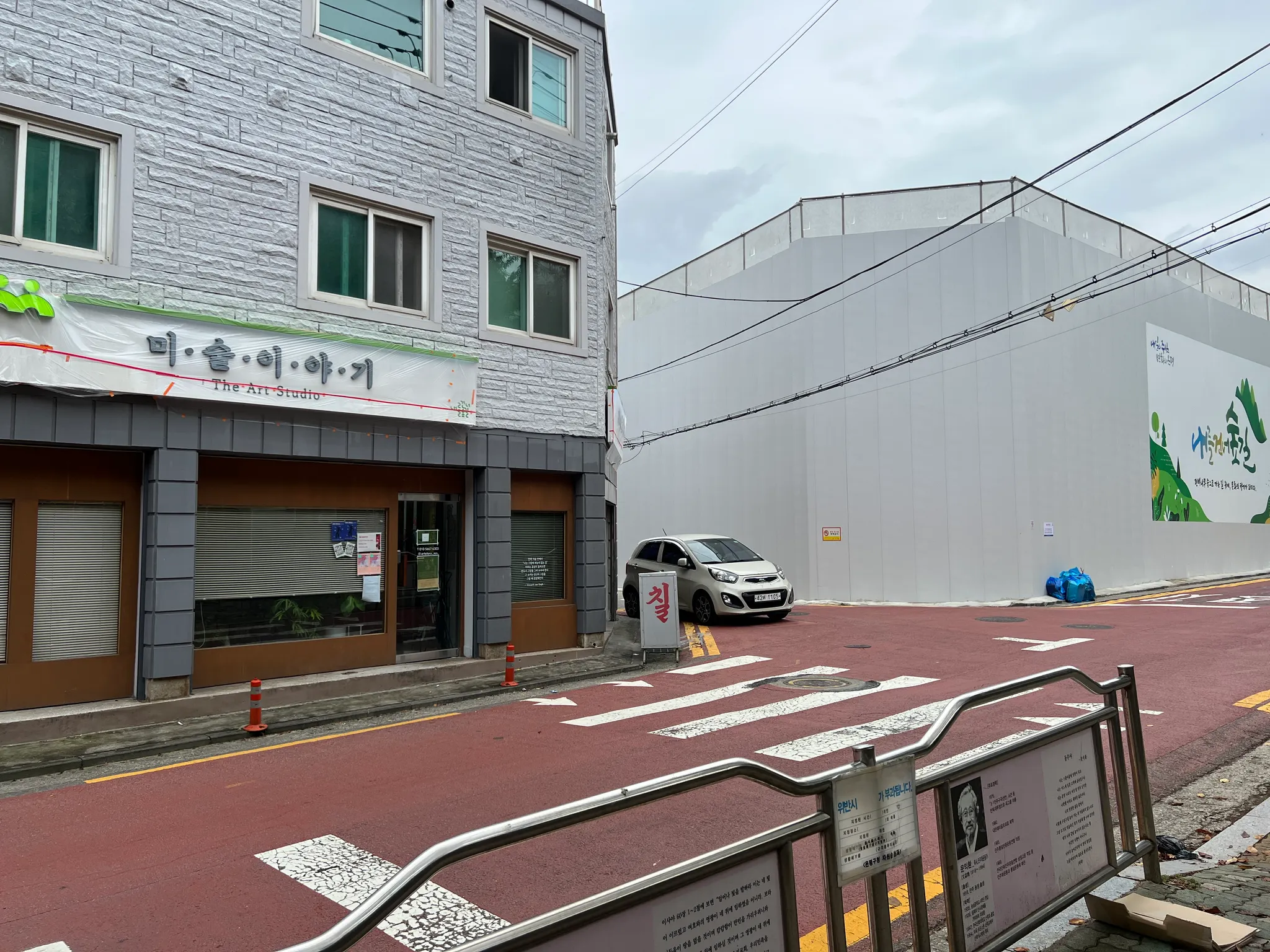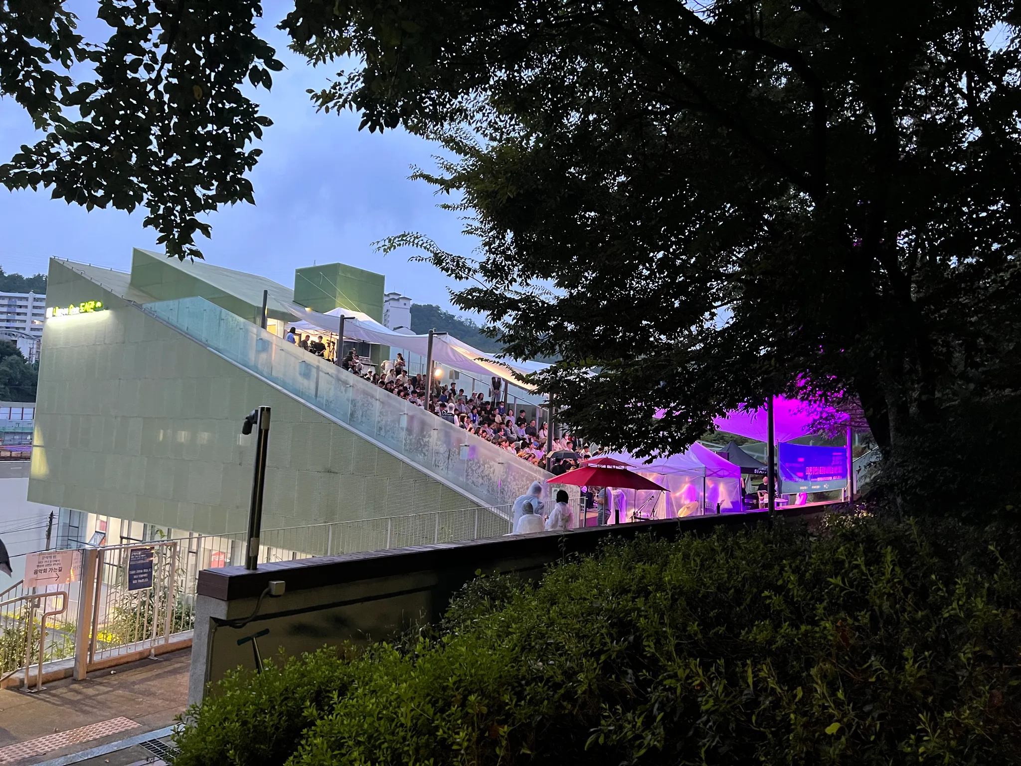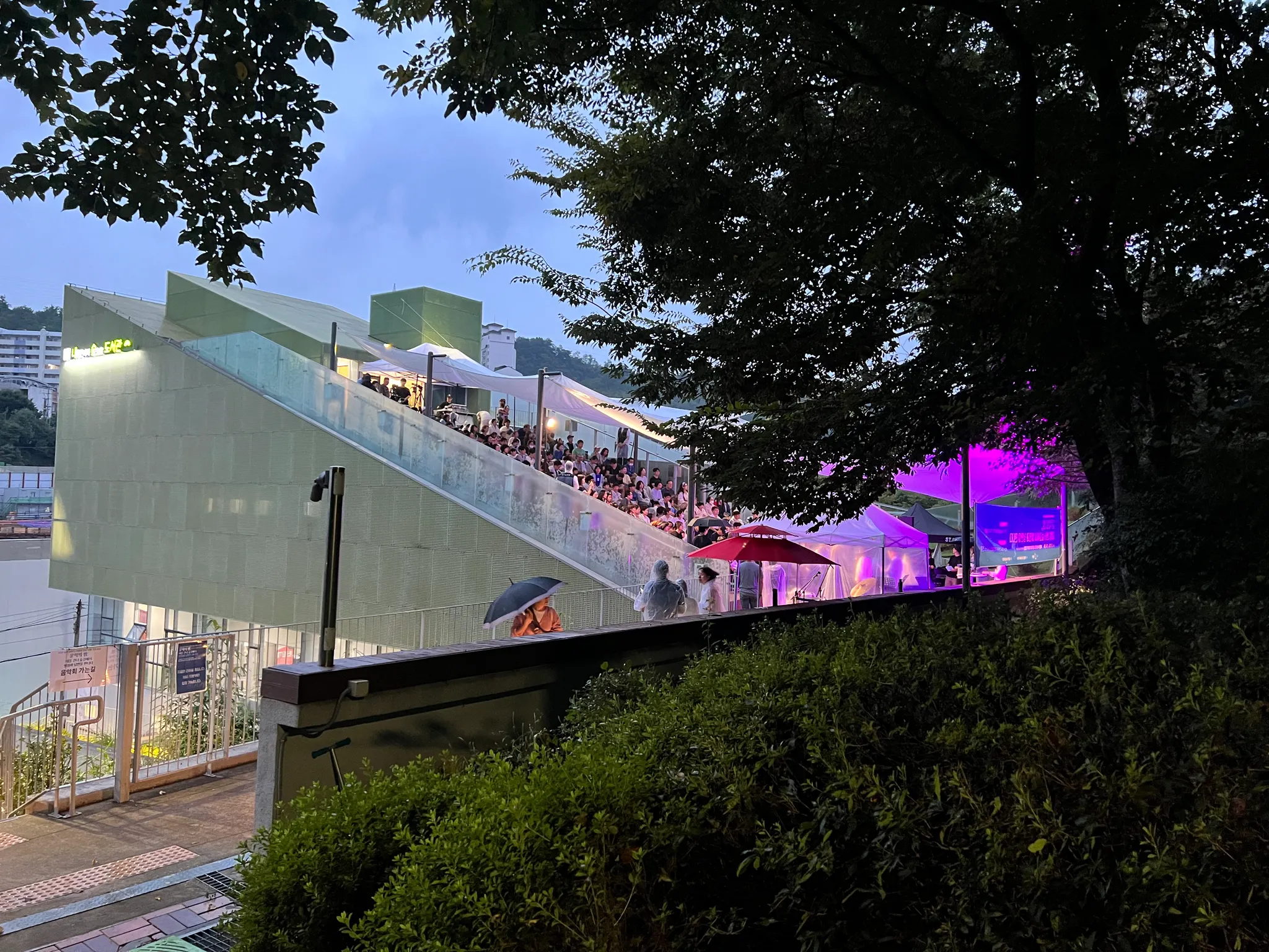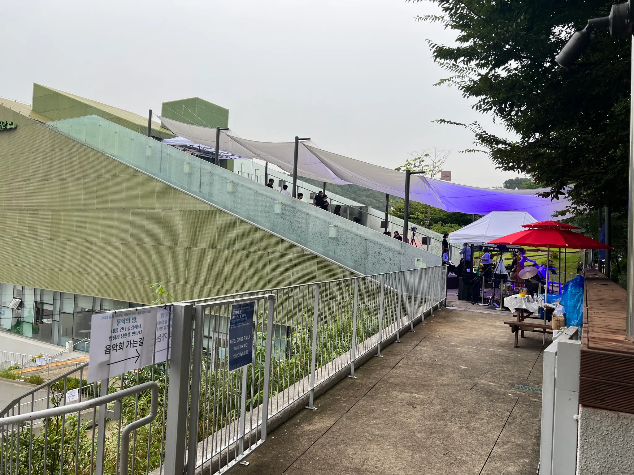 2.판데믹 기간동안 조용했던 내숲 도서관의 옥상 공연장에서 음악회가 열린 날, 종일 보슬비가 내렸다. 빗 속에서도 미리 예약하고 찾아온 관람객들이 우비를 입고 앉아 시낭송과 음악을 들으며 열기로 가득했다. 도서관 맞은편으로는 재개발 공사가 한창이다. (a3그림)