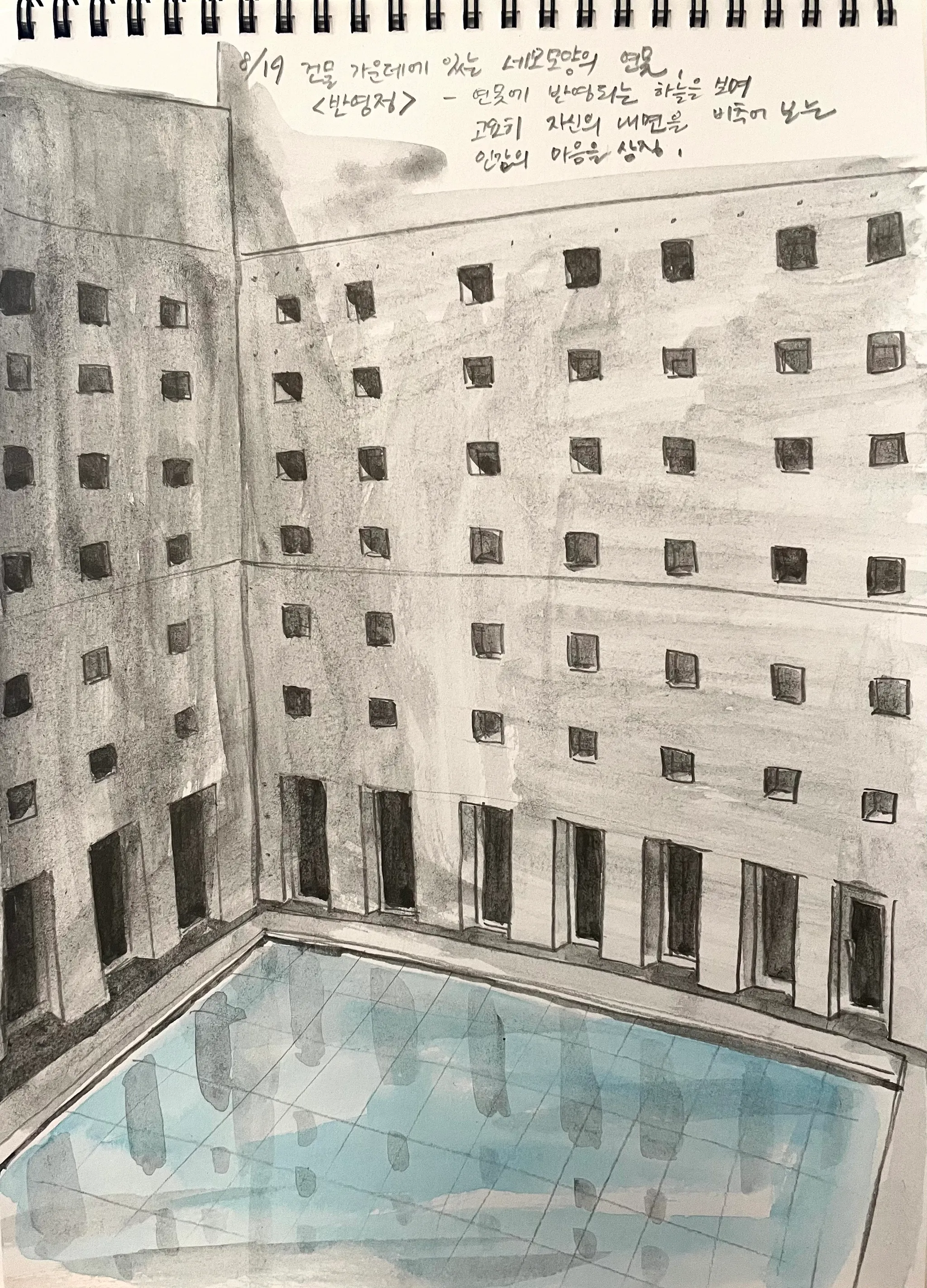 하지만 또 도서관이라는 역할에서 본다면 작은 창들을 통해 들어오는 적당한 햇빛과 연못의 풍경이 더욱 알맞아 보이기도 한다.
