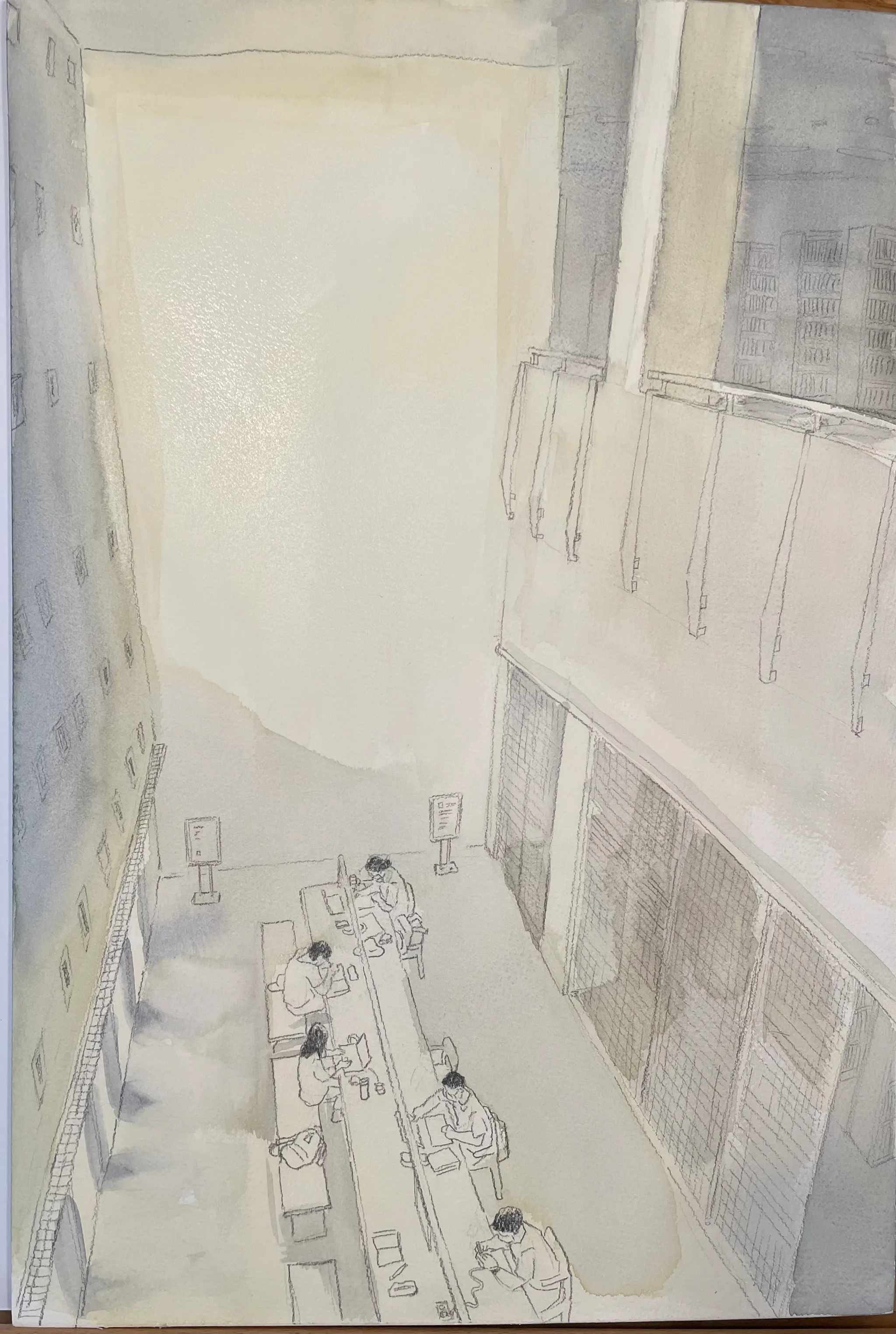 자세한 묘사보다는 각 그림에서 줄 수 있는 공간적, 기능적 역할에 더 치중을 하는 것이 작업의 기준점이였다. 슬쩍 보이는 책들과 큰 벽면에 보여지는 영상아트, 그 앞에서 각자의 도서관활동을 하는 청년들의 모습이다. 신기하게도 이 공간에는 나이드신 분들이 보이지 않았다. 뭔가 어색하셨을까? 아니면 당신들이 누릴 공간을 아니라고 여긴걸까.