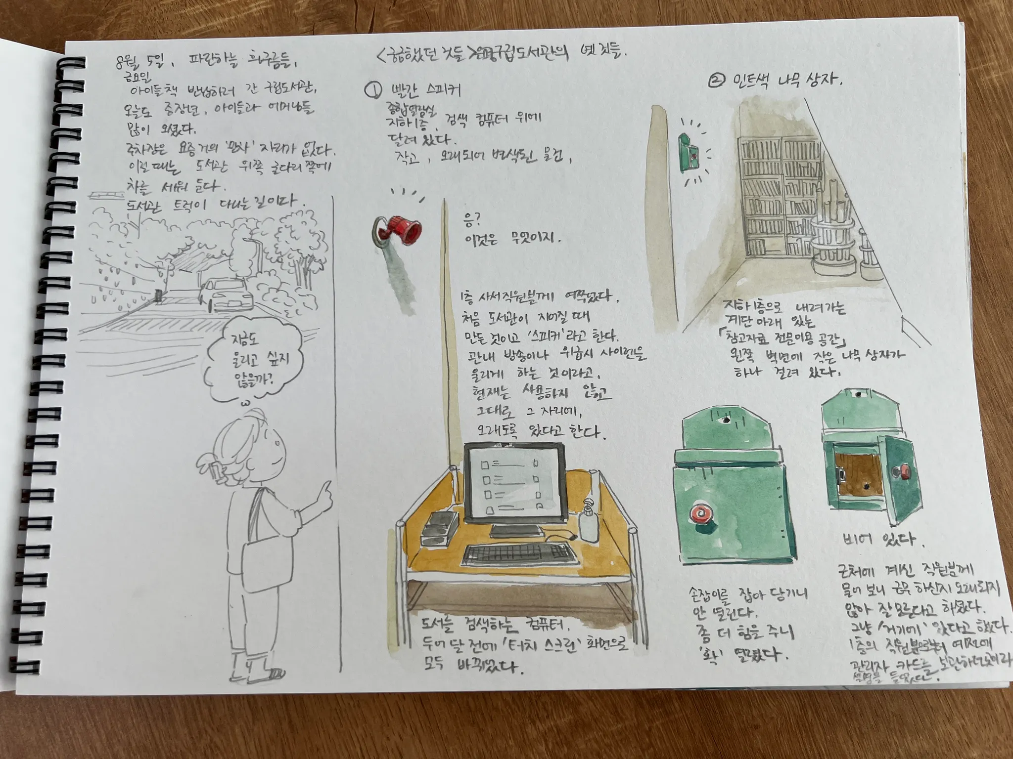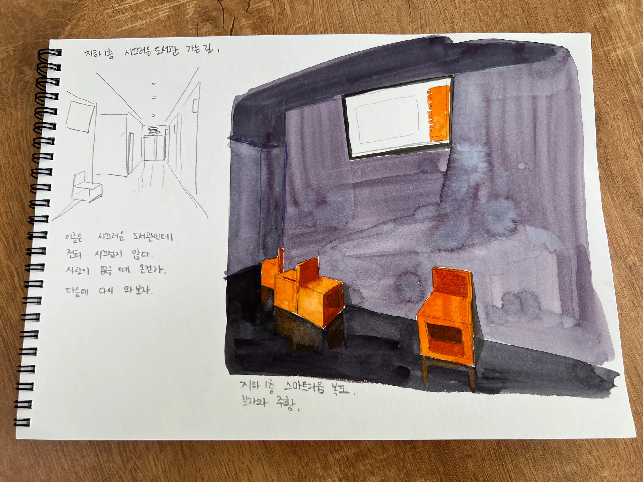 지하 1층을 리모델링하여 6월에 개관한 ‘스마트리움’의 복도 풍경을 그려 보았다. 계단에서 내려가면 오른 편은 디지털체험과 강의를 들을 수 있는 공간들이 있고 왼 편에는 가족들이 모두 편하게 소리내어 책을 읽을 수 있는 ‘시끄러운 도서관’이 있다