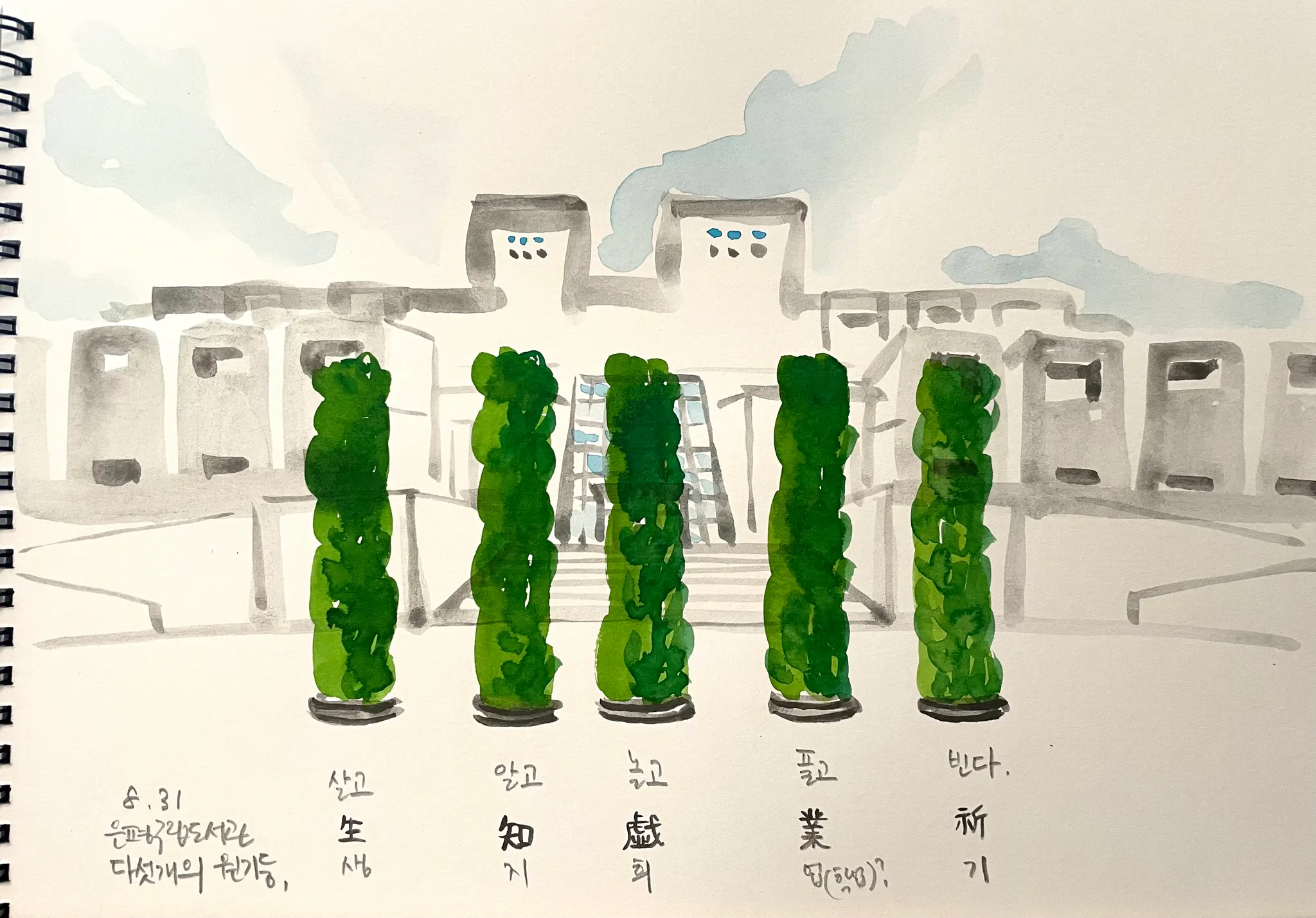 은평구립도서관에 가면 처음 볼 수 있는 거대한 기둥들이 있다. 갈 때마다 보는 것이라 신기하게 여기지 않았는데 로컬아카이빙을 하며 다시 바라보니 이 기둥이 그냥 서 있는것은 아닐거라는 생각이 들었다. (좁고 높은 언더길에 힘들게 이 무거운 것들을 이고와서 세워 놓았으니…). 자료를 인터넷에서 찾아보니 건축관련된 블로그에서 그 뜻을 찾을 수 있었다. (네이버블로그명: 평론가 이용재와 그의 딸 화영, 그리고 건축)
