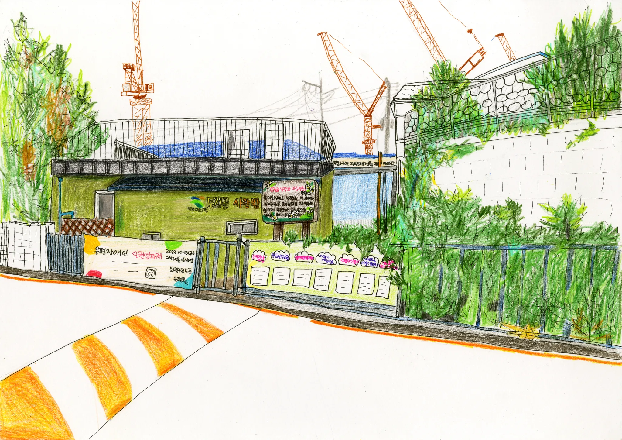 : 토정골 사랑방에서는 많은 활동들이 있었다. 그중에 마을 정원도 있었는데 지금은 인테리어 공사로 인해서 식물들이 나 제거된 상태이다. 그림은 식물이 제거되기 전의 모습. 뒤편에 재개발 현장도 보이지만 변화와 유지의 적정한 선은 어디일 것인가가 항상 어렵다.