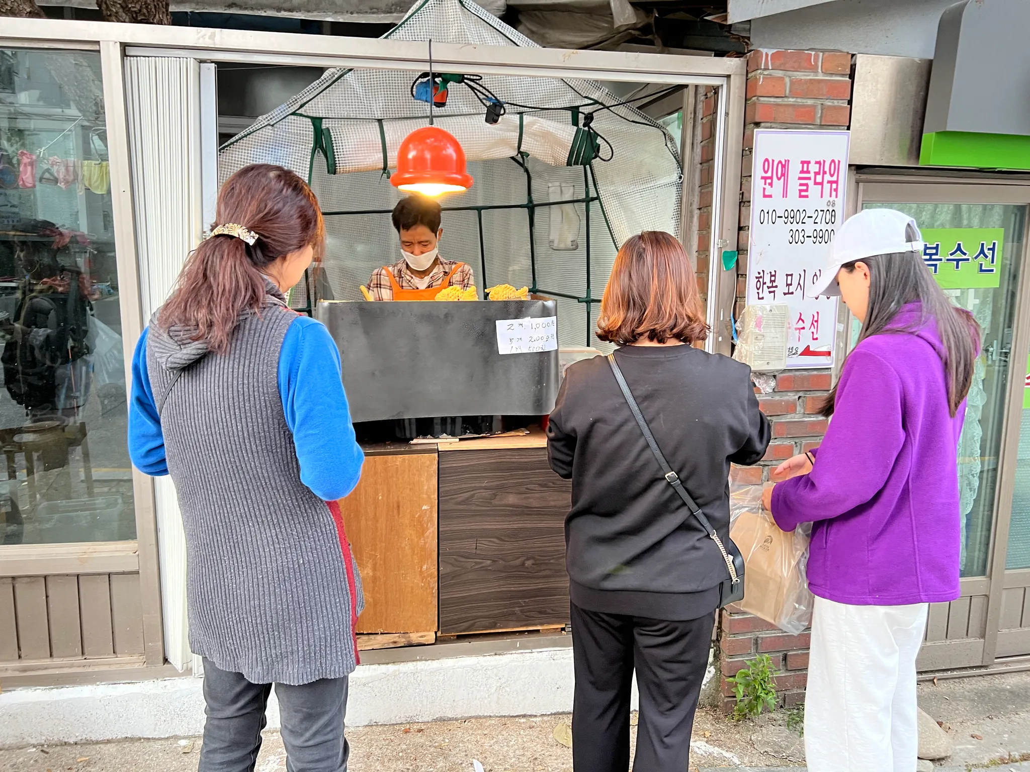 1.새절역에서 내숲도서관을 지나 봉산으로 향하는 길에는 ‘내를건너숲길’ 이라는 이름이 붙어있다. 도서관의 로고와 닮은 간판이 줄지어선 가게들 사이에서 오래된 단독주택의 한켠을 차지한 수선집과, 그 옆의 간이 포장마차의 붕어빵집의 정겨운 풍경. (a3그림)