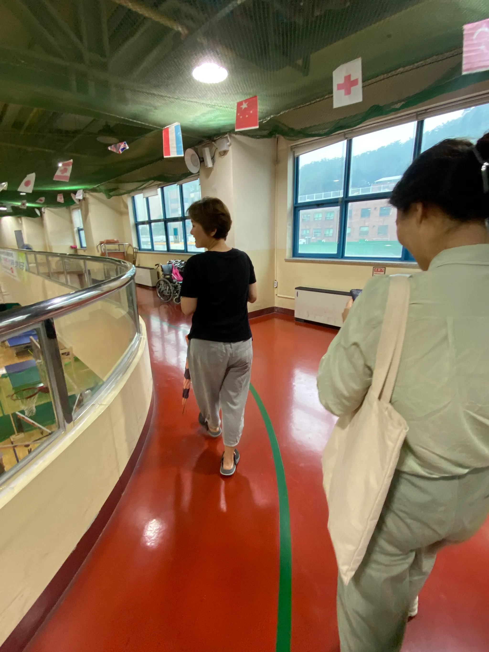 6층은 트랙장이 설치가 되어 있었는데 날씨가 좋지 않은 날이나 여름이나 겨울에 어르신들이 따뜻한 실내에서 걷기 운동을 할 수 있게 만들어진 공간이다. 아래가 내려다 보여서 트랙장을 걸으며 5층 대체육관에서 활동하는 모습을 볼 수 있다.