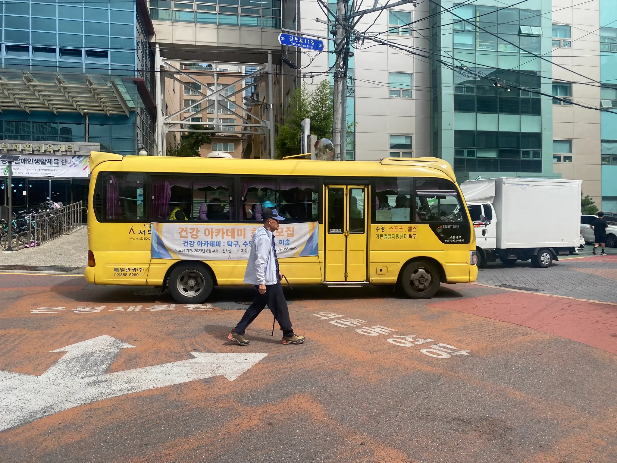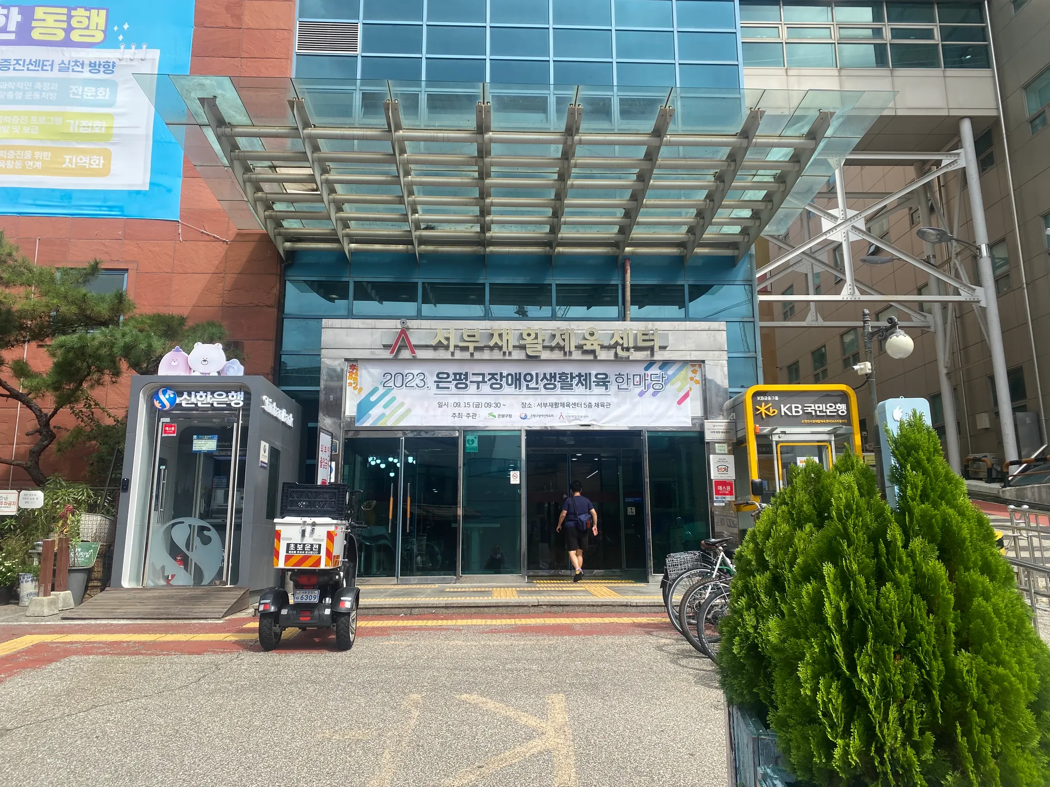 노란색 셔틀버스로 한눈에 들어오며, 현수막에는 건강아카데미를 모집한다고 쓰여있다. 아동발달지원센터도 적혀있으며, 이 버스만 보더라도 서부재활체육센터에서 무엇을 하는지 알 수 있었다.