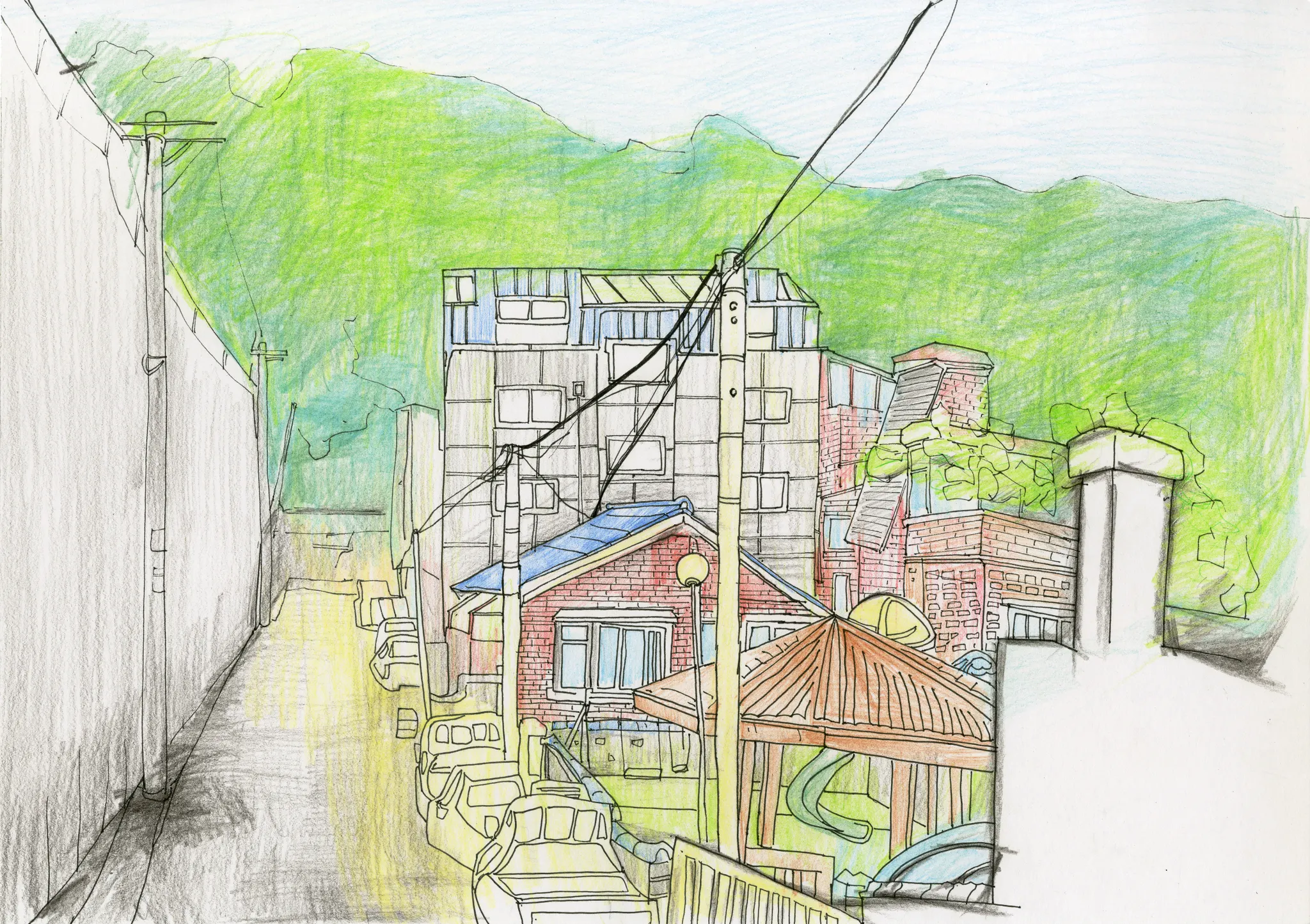 골목 중간 중간에 비단산 일부와 다양한 형태의 주택들이 보인다.