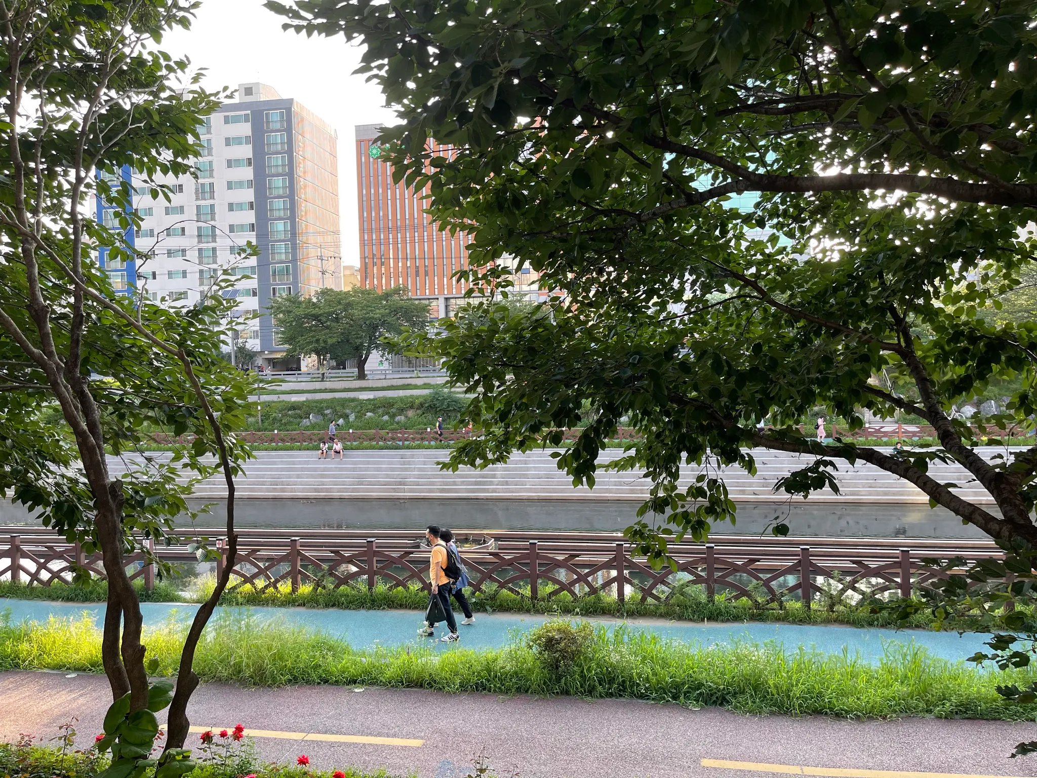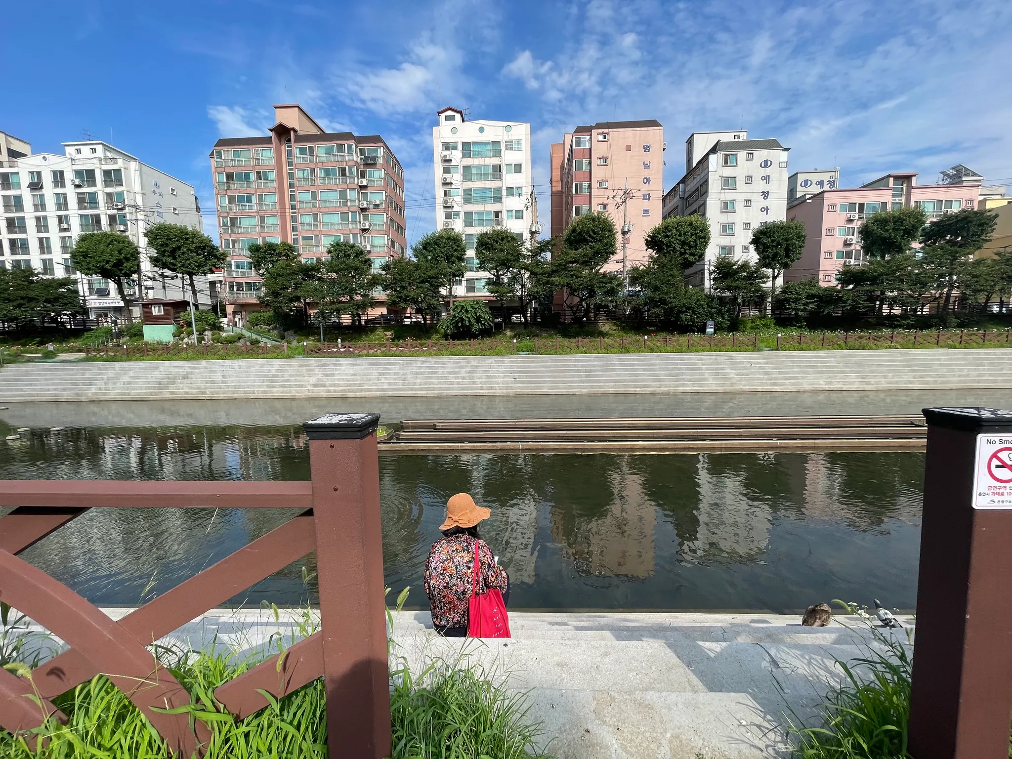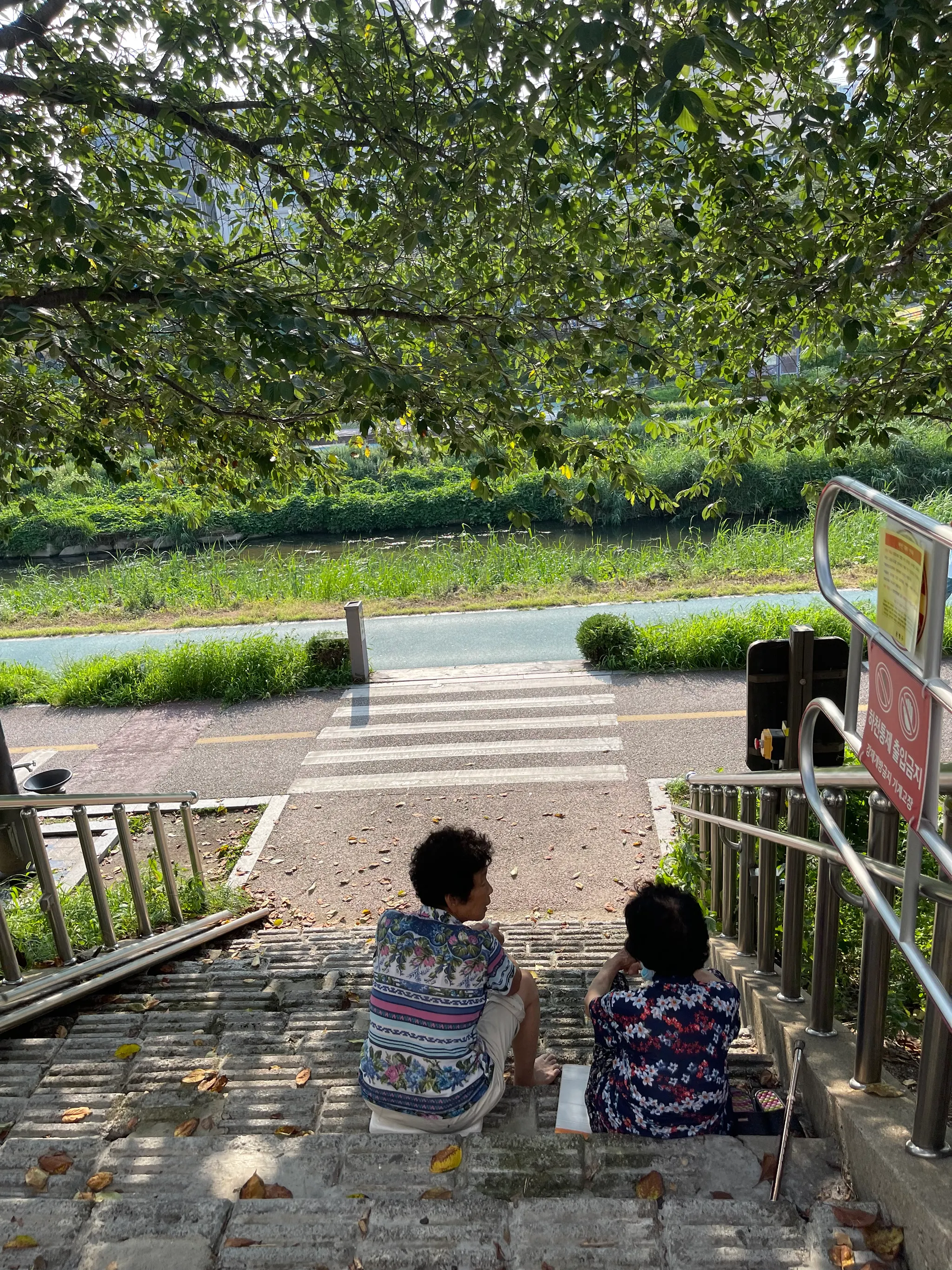 건너보니 하늘이 너무 좋다. 반짝반짝하다. 더운 여름 날씨지만 하늘이 이렇게 예뻐서 인지 사람이 많다. 펜데믹 이전처럼 삼삼오오 모여서 바둑 혹은 장기를 두시는 분. 함께 산책하거나 조깅 하시는 분. 조용히 앉아 대화를 나누시는 분. 책을 보시는 분..