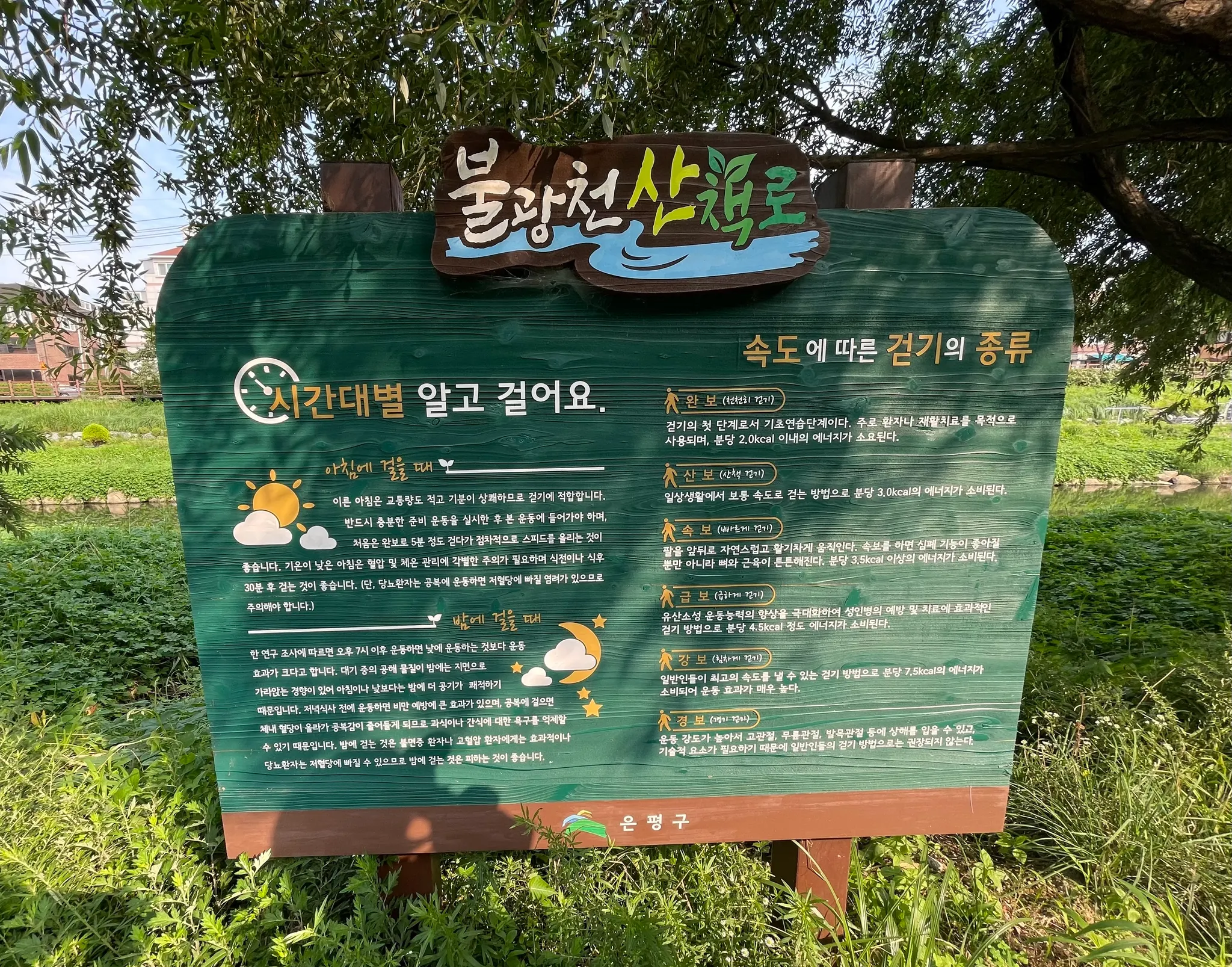 흐리고 비가 오다말다하는 궂은 날씨에도 불구하고 꽤 많은 사람들이 산책로를 걷고 있다. 불광천은 은평구불광동 북한산 산기슭에서 시작되는 개천이며, 한강으로 흐르는 건식 개천이라고 한다.