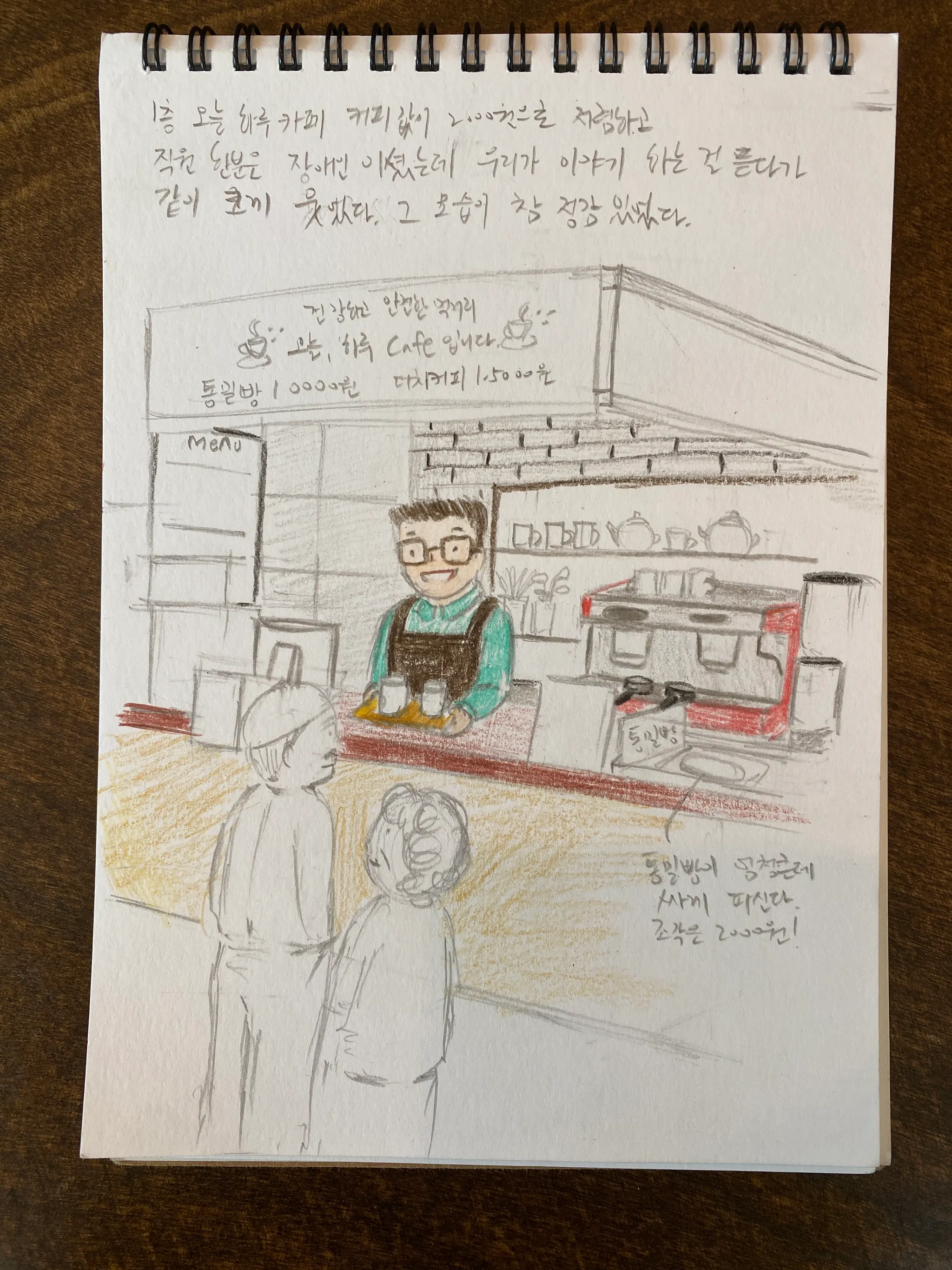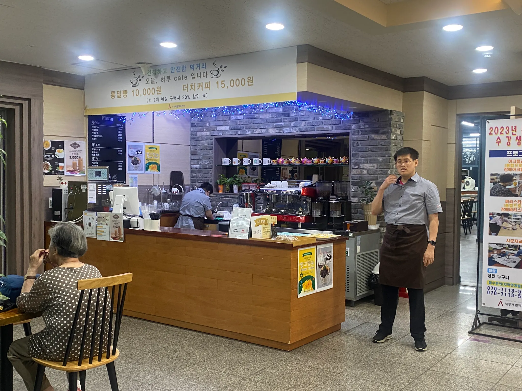 1층 오늘, 하루 카페 커피값이 참 싸다. 장애인 직원이 커피를 내려준다.