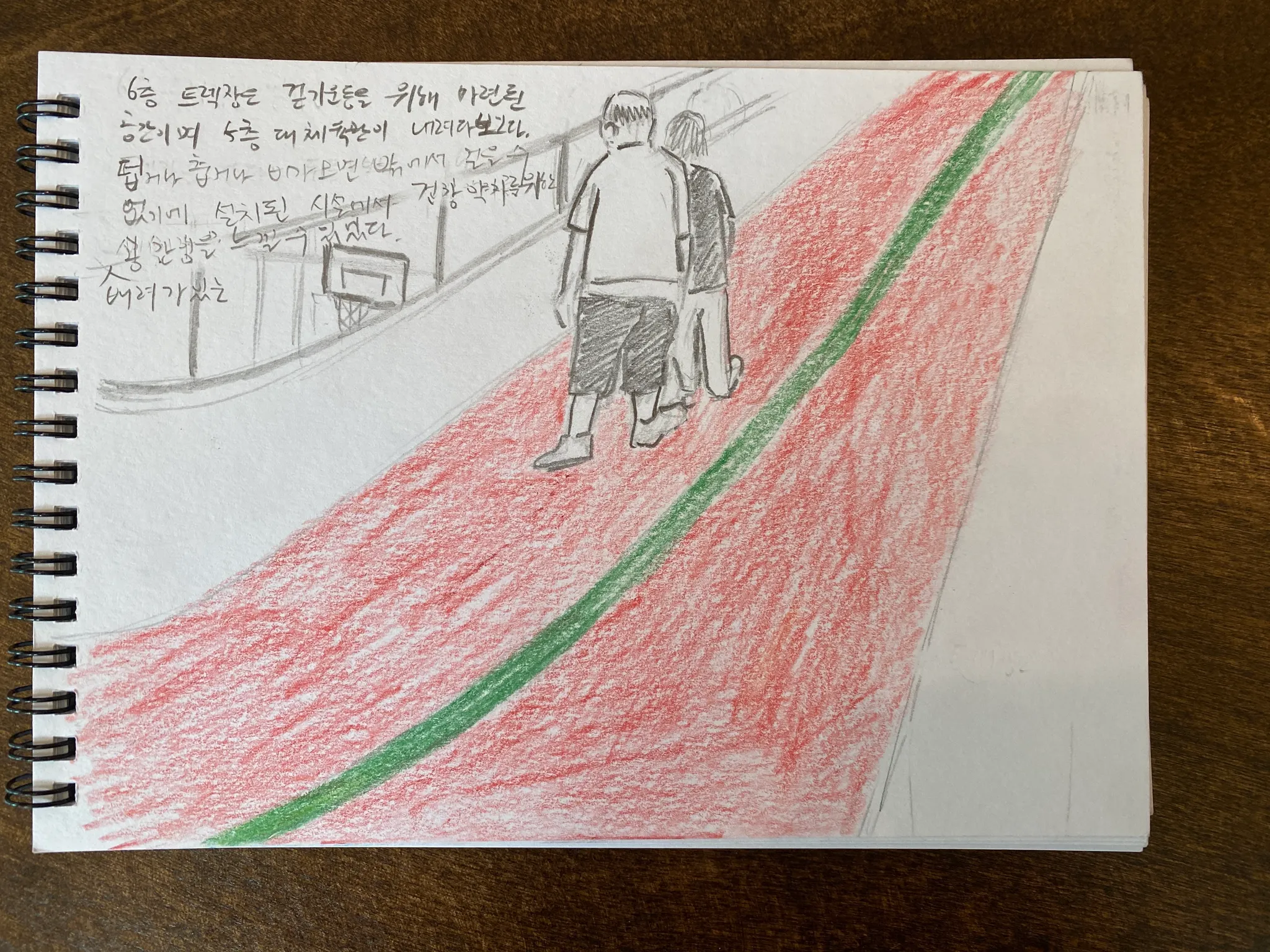 처음 방문 했을 때 트랙장을 따라 걸어보는데 뒤에 같이 걷던 할머니 한분이 계셨다. 뒤 돌아서 갈까 잠시 고민하며 돌아보니 어서 가라는 눈빛이셔서 한바퀴를 다 돌고 나왔는데 나야 조사를 위해 온 것이지만 이런 작은 시설 하나도 암묵적인 규칙이 있다는 걸 알게 했고, 단순히 앞만 보고 걷기만 할 수 있는 것이 아니라 아래를 내려다 보며 걸을 수 있는 점이 단순 운동을 위함이 아닌 함께 하는 공간의 따뜻함을 느끼게 했디.