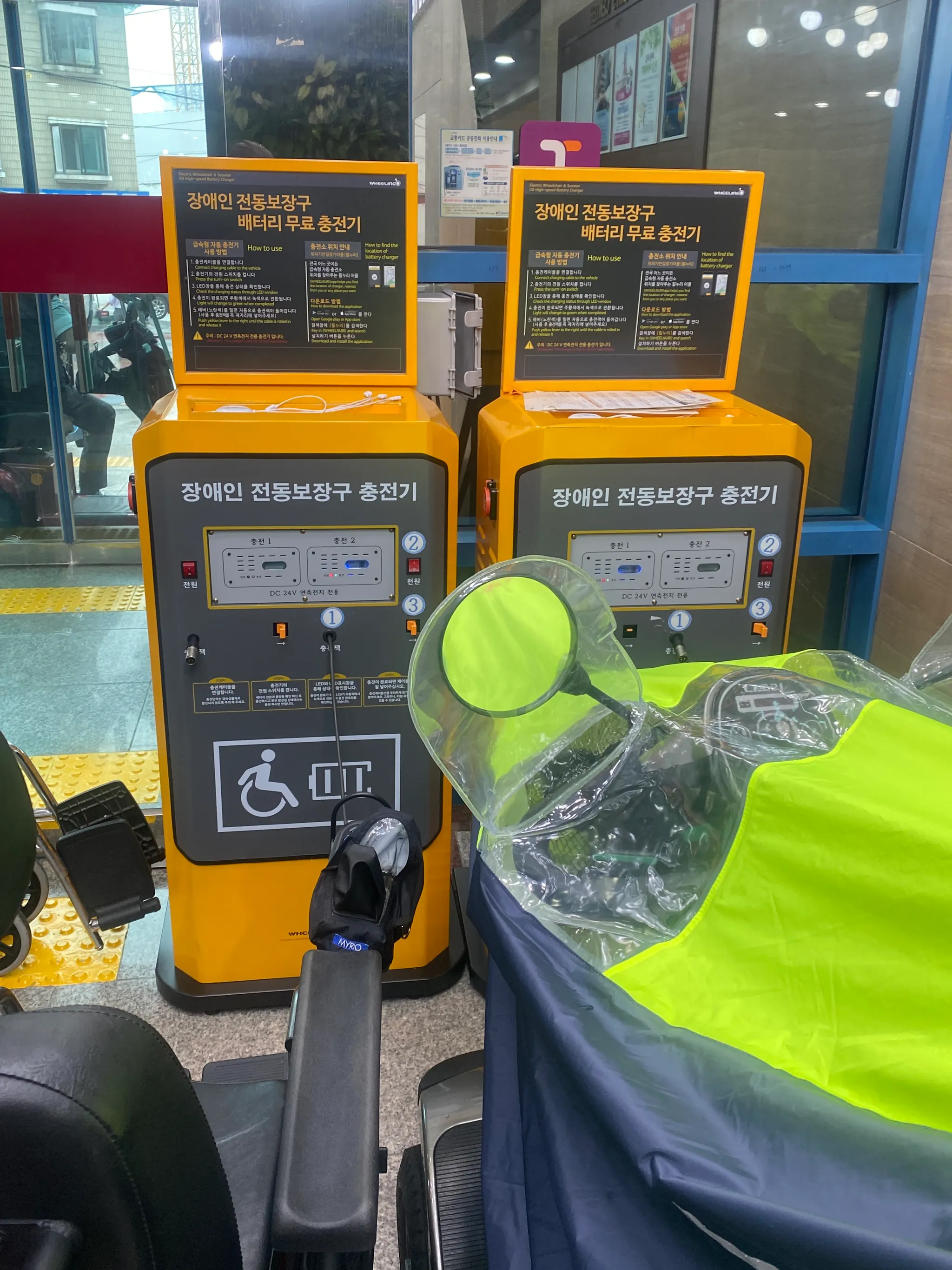 장애인 전동 보장구 배터리 무료충전기 2대가 입구 안쪽에 설치 되어 있어서 전동 휠체어를 충전 할 수 있다.