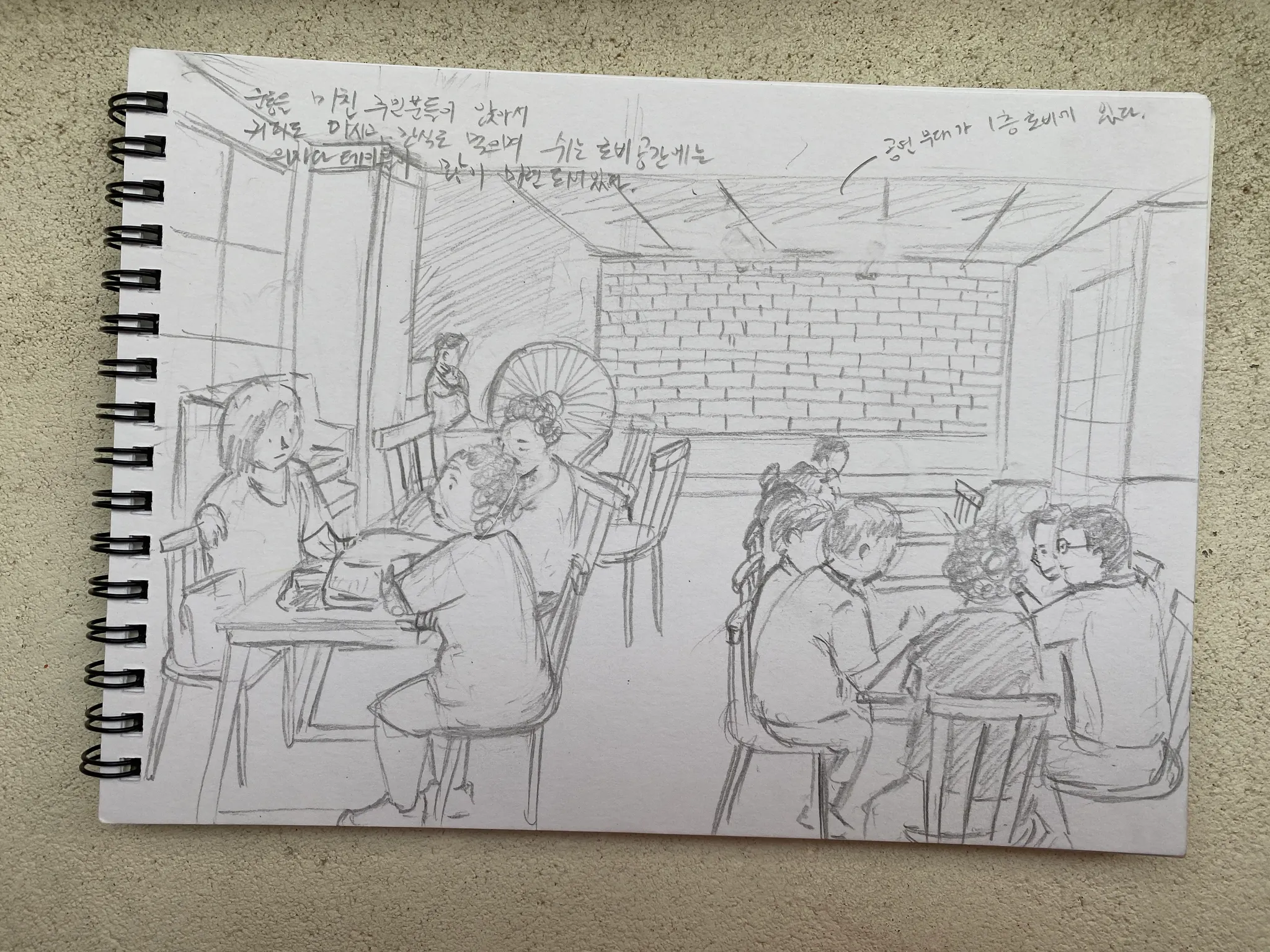 1층 직원 휴게 및 식사를 하는 공간인데 주민들이 쉬는 공간으로도 이용되며, 문화 교실 수업장으로도 사용한다.(그림기록 예정)