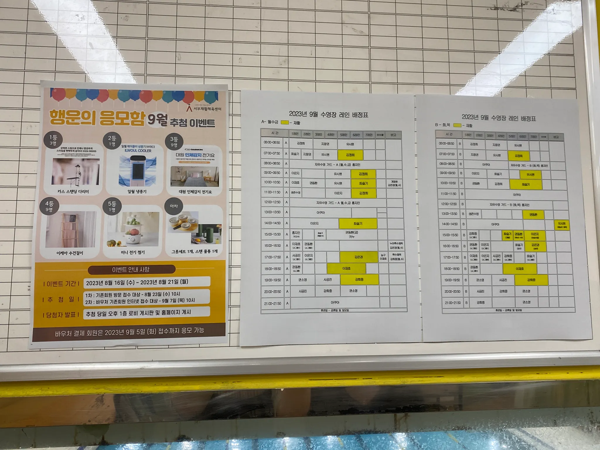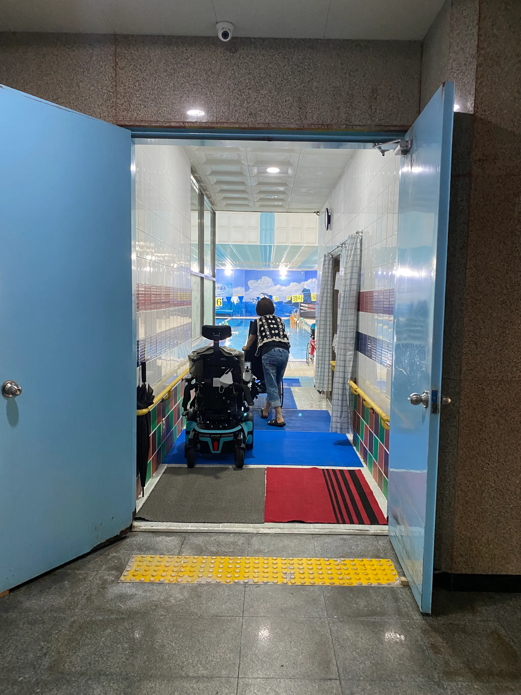 경사로가 있는 수영장을 처음 봤는데 휠체어가 들어갈 수 있도록 만들어진 수영장이라고 한다. 노란색으로 경사로라고 잘 보이게 표시가 되어 있다.