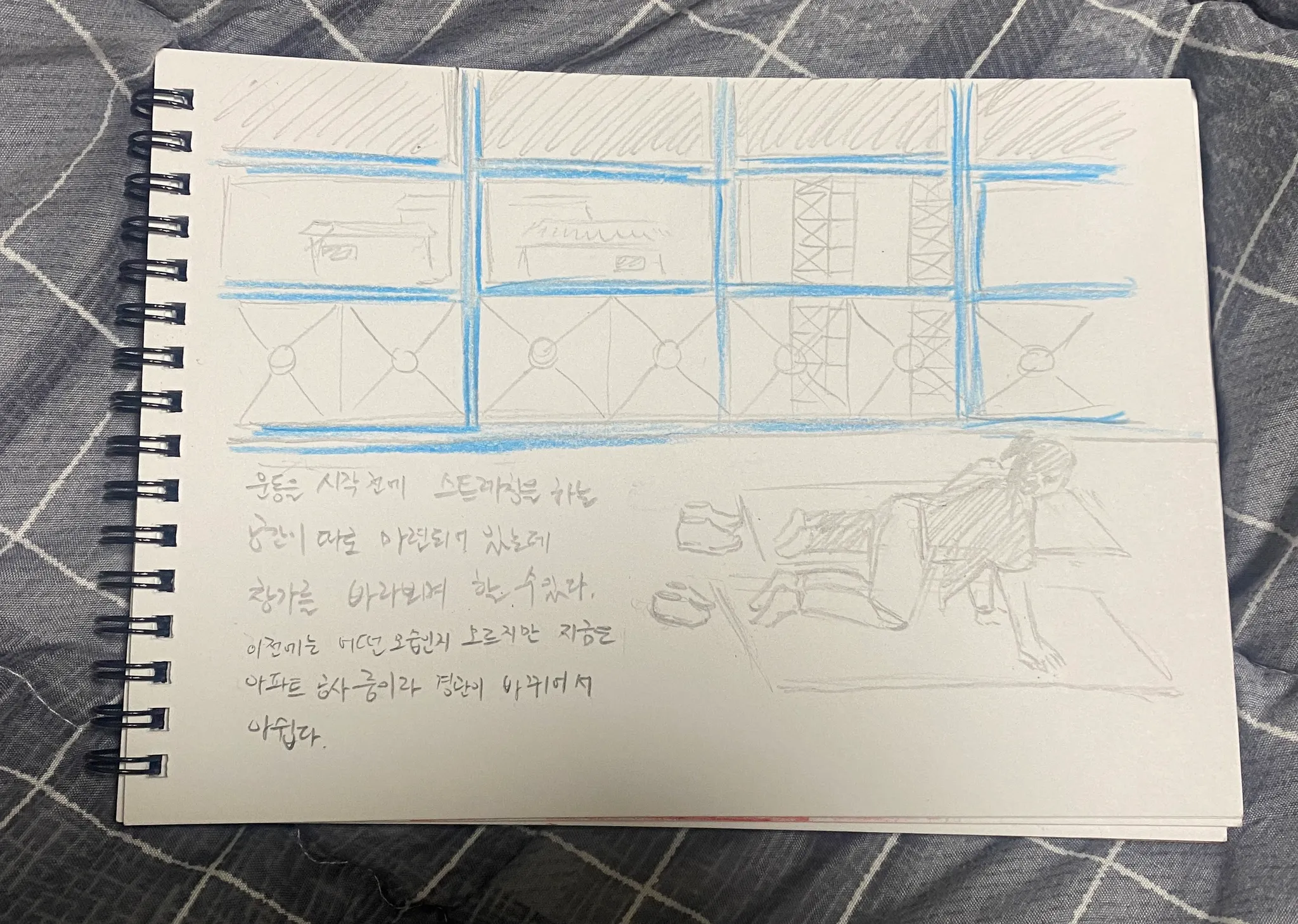창가를 바라보며 런닝머신을 탈 수 있다. 이전에는 아마도 집들이 옹기 종기 보여서 운동하면서 경치를 볼 수 있다는 점이 운동하면사도 또다른 즐거움이었을 것 같은데 지금은 아파트 공사가 한참이라 아쉽다.(그림기록예정)