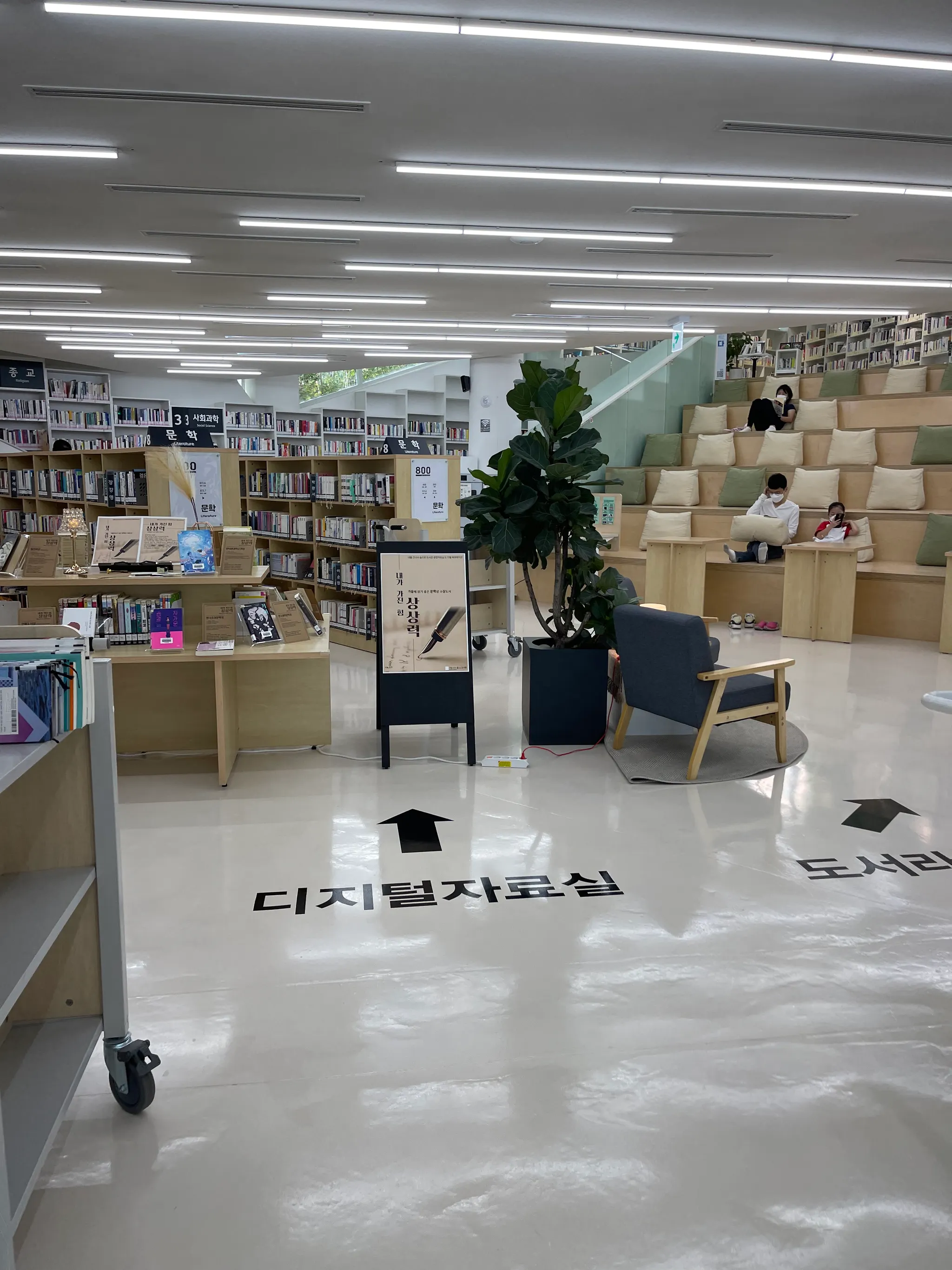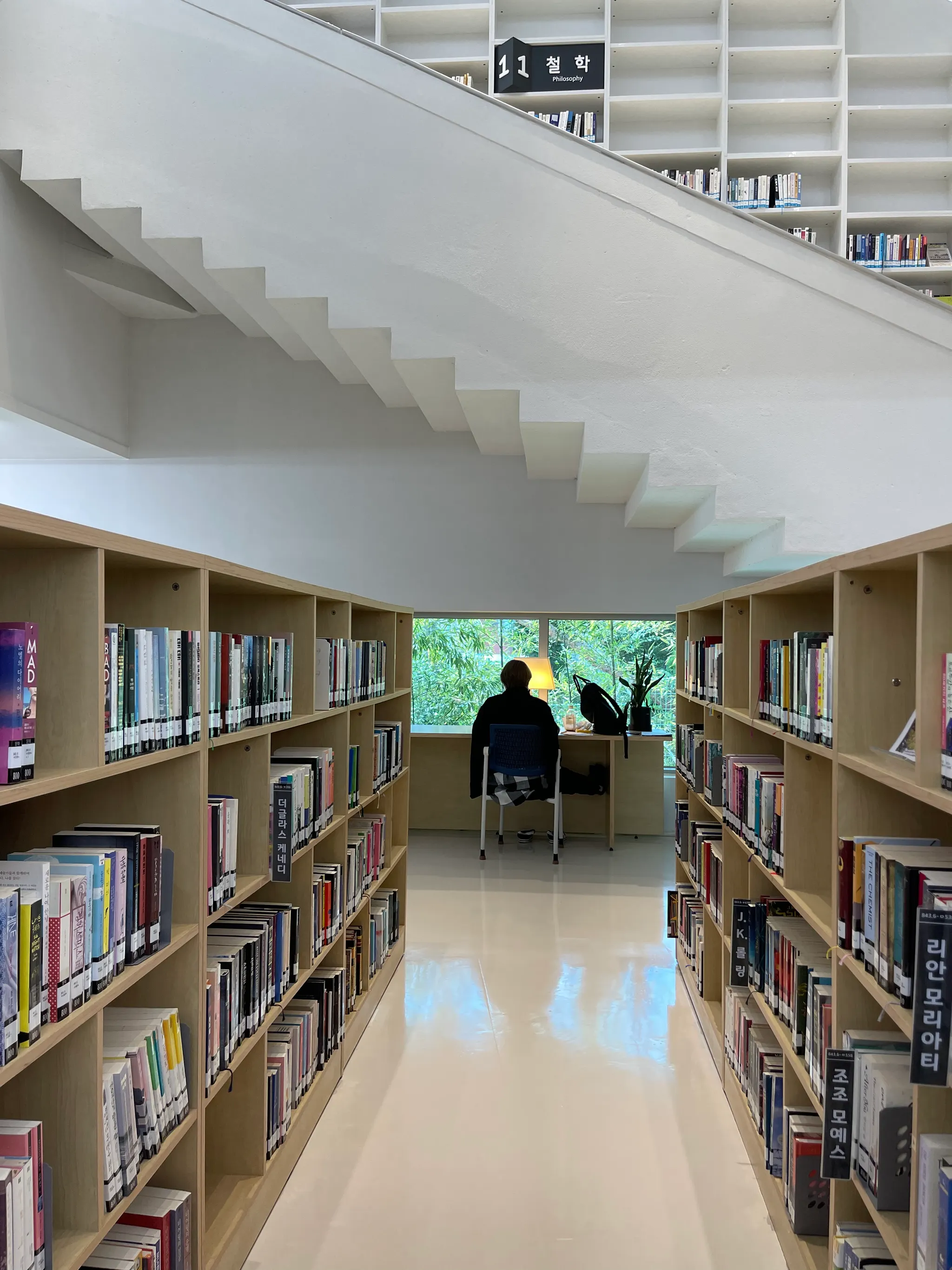 가장 인상적인 것은 2층에 있는 창밖으로 보이는 초록한 숲의 전경. 창을 따라 책상이 놓여 있다. 사람들은 숲을 마주하며 책을 보거나 공부하는 중. 그 모습을 보는 나도 힐링이 되는 느낌이다. 자연스럽게 창을 따라 시선이 움직이게 된다.