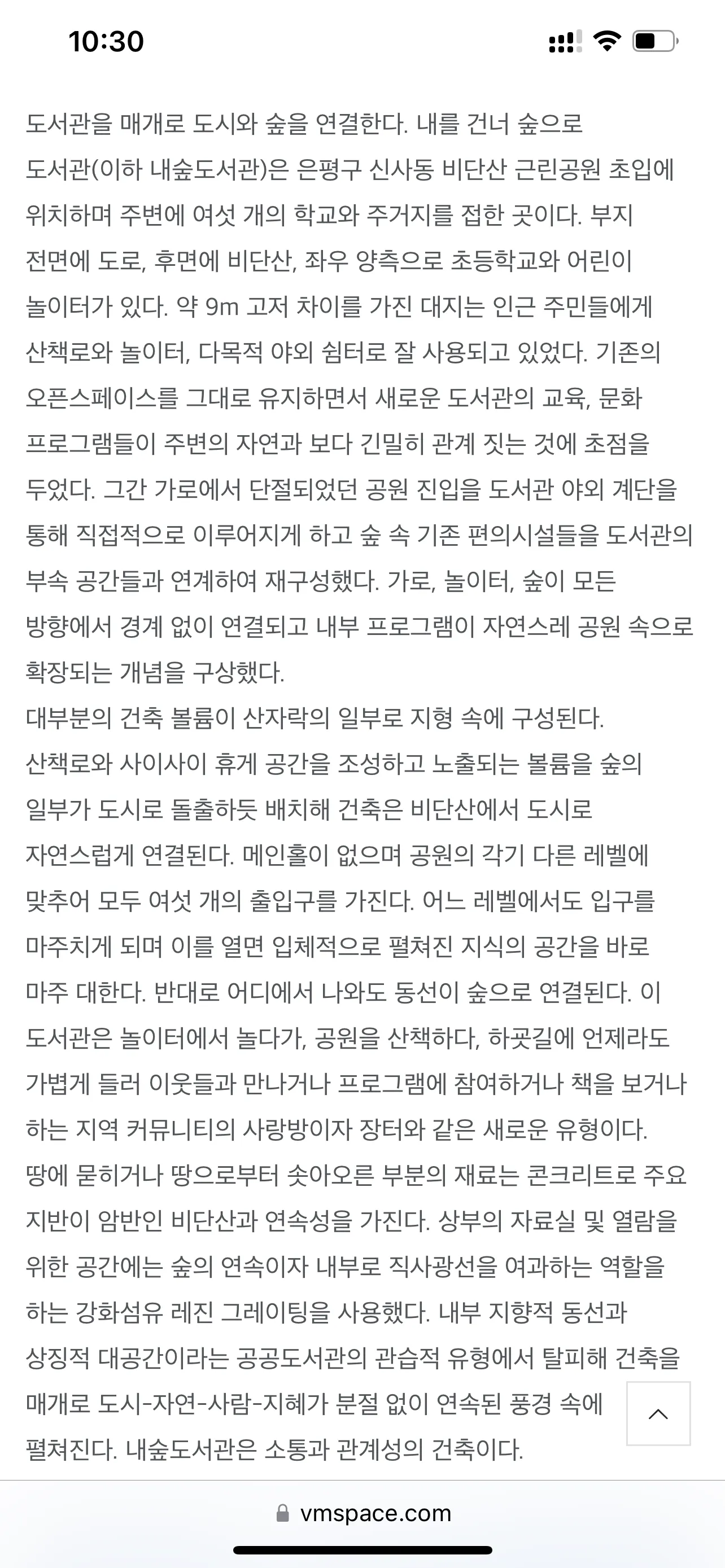 이 도서관을 만든 건축가가 직접 쓴 글이 있다. (아래첨부) 도시와 숲을 연결하는 건축물 , 도시-자연-사람-지혜가 분절이 없는 소통과 관계성의 건축물이라는 건축가의 글을 읽고 보니 도서관이 새롭게 보이는 느낌이다.