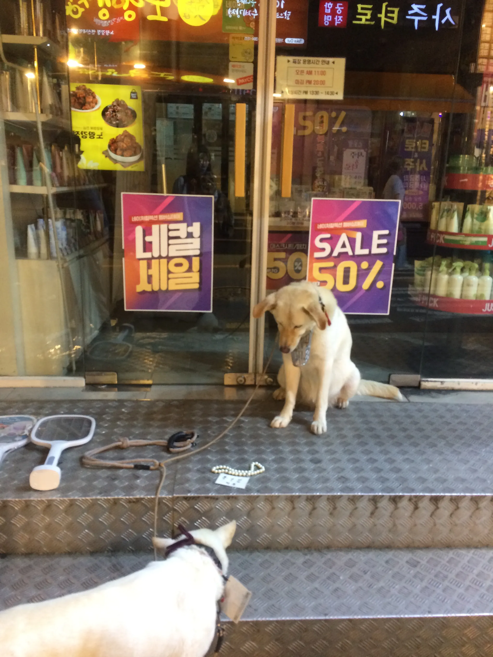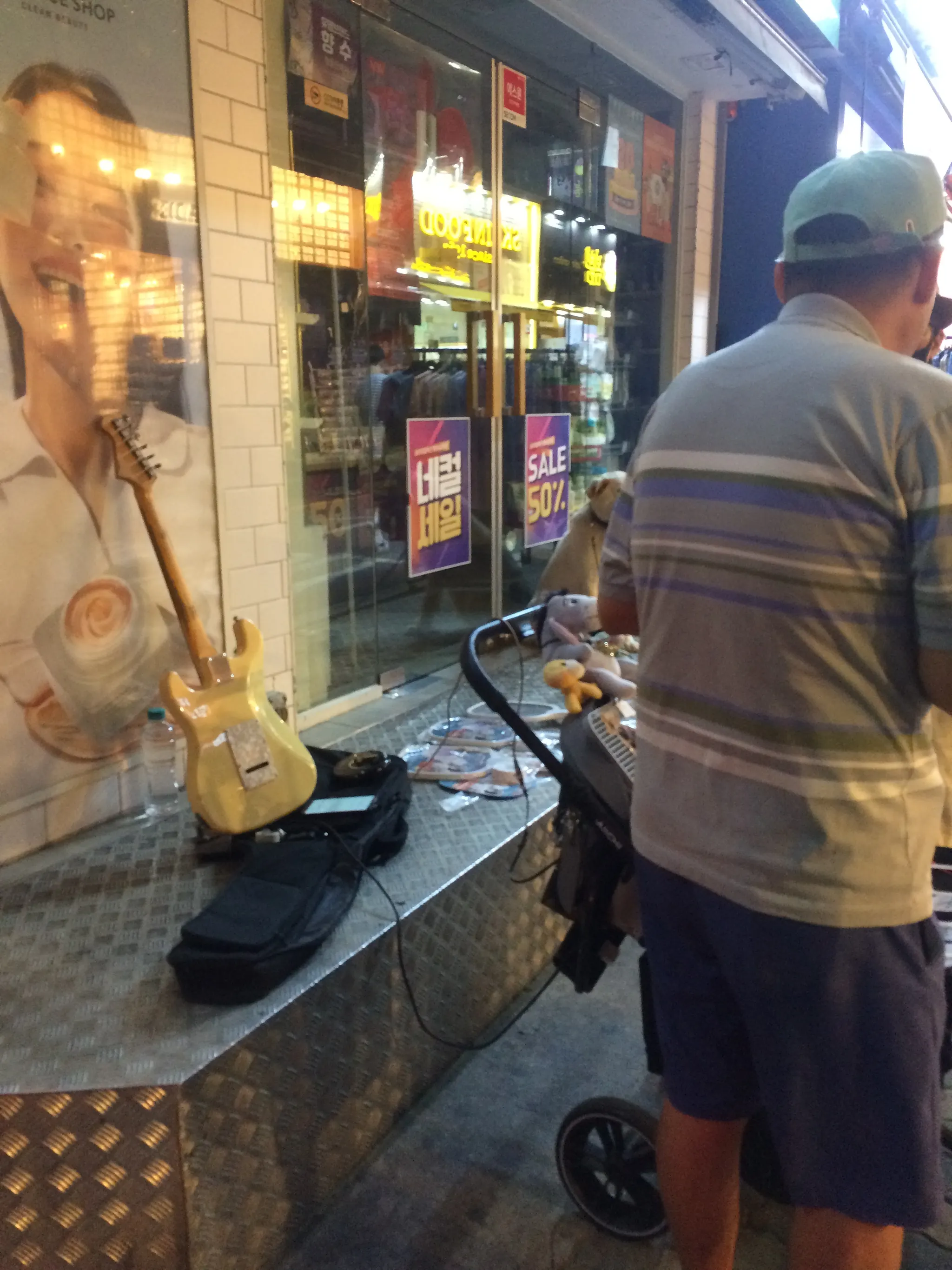 1,2) 영업을 마친 화장품 가게 앞에는 이상한 아저씨가 강아지와 함께 버스킹 준비를 하고 계시다.