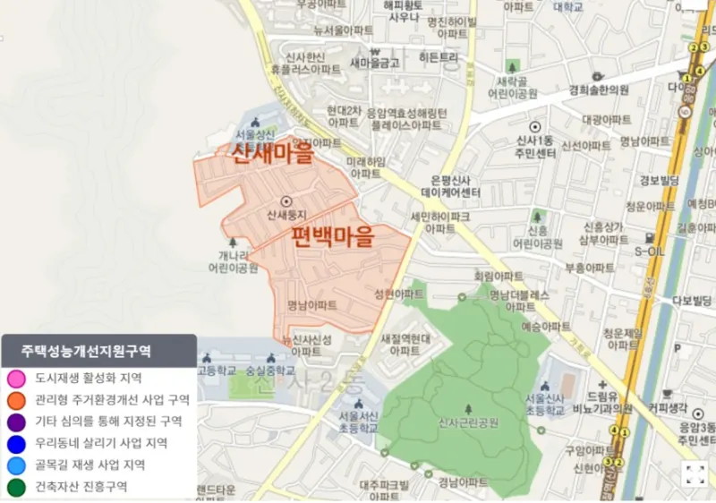 박원순 전 서울시장표 도시재생 사업의 상징과 같았던 은평구 신사동 산새마을과 편백마을이 오세훈 서울시장이 추진하는 '신속통합 재개발 후보지'에 선정됐다. 서울시는 오세훈 표 재개발 사업으로 약 3만 4천가구가 공급될 것이라 발표했지만 높은 금리와 부동산 가격이 하락하는 등 민간 시장이 따라주지 못하는 환경속에서 재개발이 순조롭게 이루어질지는 의문이다.