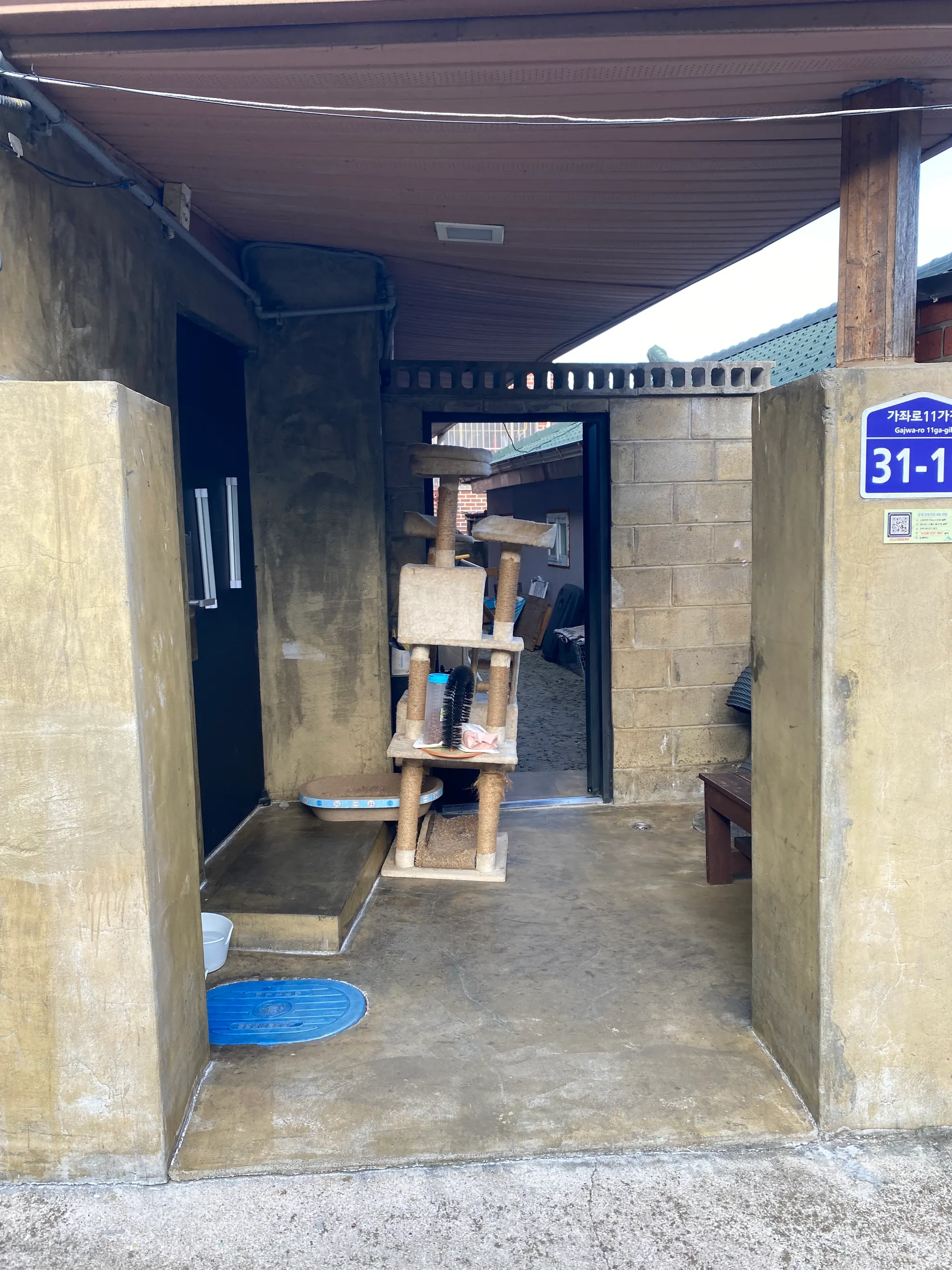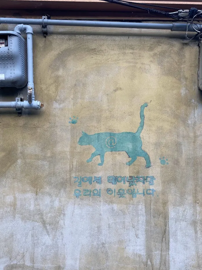 텃밭 주변 골목을 걷다 우연히 들여다 보게 된 한 주택. 대문없는 이 집 마당 한켠에는 산새마을의 또 다른 이웃, 고양이가 사는 집이 있었다. 그리고 이 집의 담벼락에는 산새마을의 동물을 이웃삼아 함께 살고 있는 집주인의 마음이 곳곳에 남겨있다.