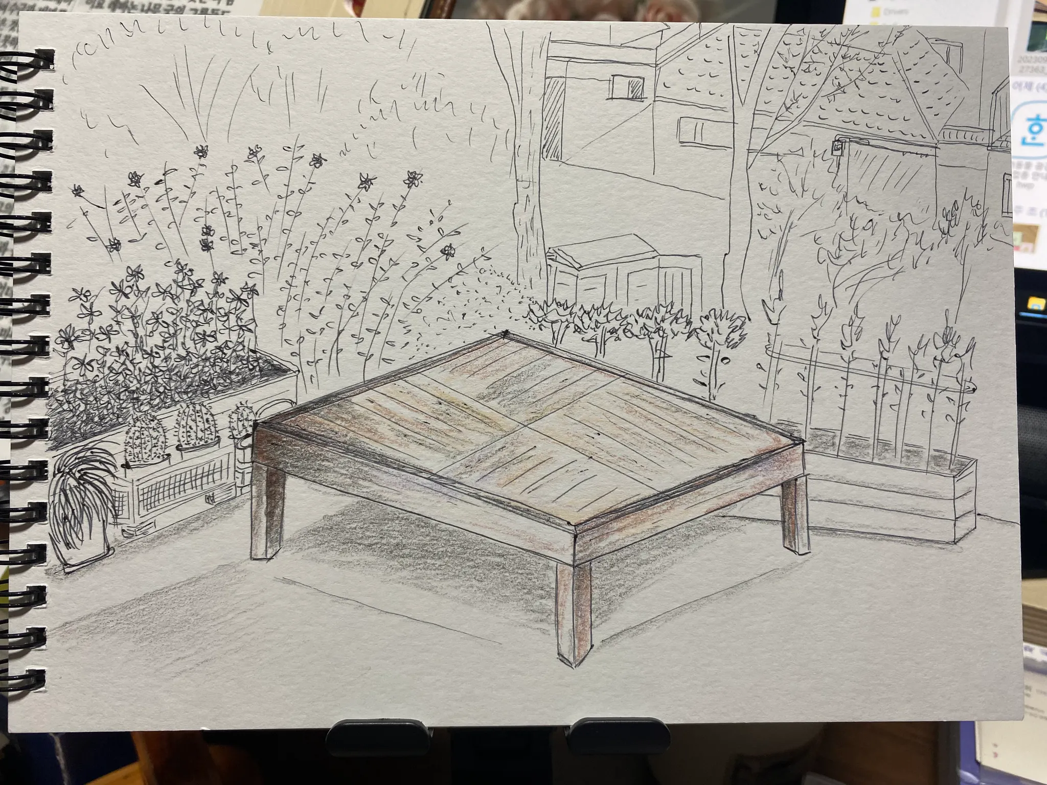 산새마을 텃밭이 내려다 보이는 작은 정원에는 마치 텃밭과 정원을 지키듯 나무 평상이 자리 잡고 있다. 마을 사람들의 이야기가 이 평상 위에서 오고 갔을 것이다.