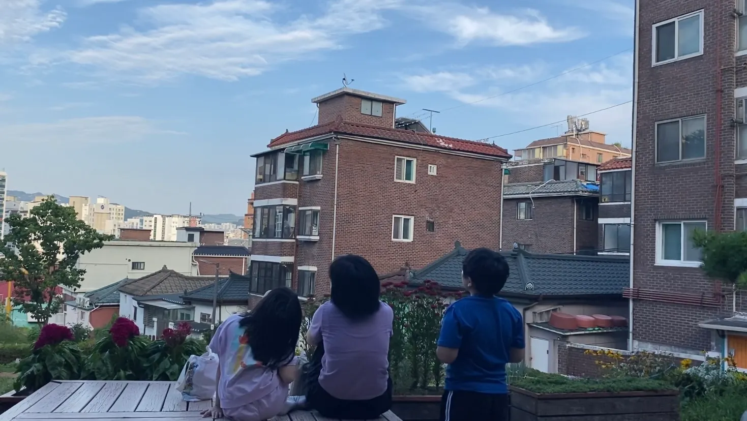 가족들이 함께 텃밭에서 상추를 수확하고 평상에 앉아 땀을 식히며 마을을 내려다보는 모습이 평온해 보인다.