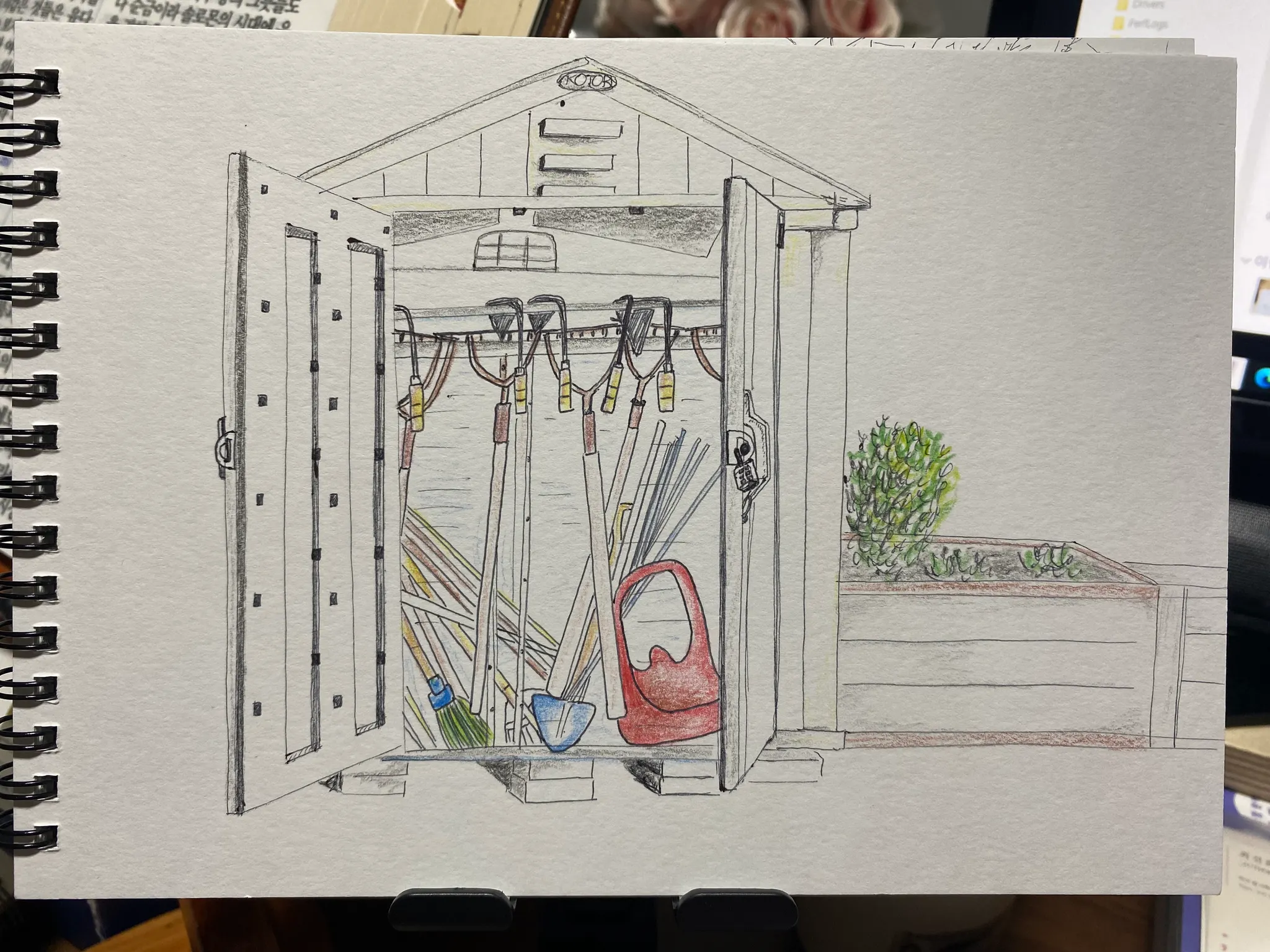 산새마을 공동 텃밭 한켠에는 텃밭을 가꾸는 각종 농기구와 주변 정리를 위해 사용하는 청소 도구를 보관하는 창고가 자리잡고 있다. 가꾸고 돌보려는 마을 사람들의 결심이 깃든 보물 창고다.