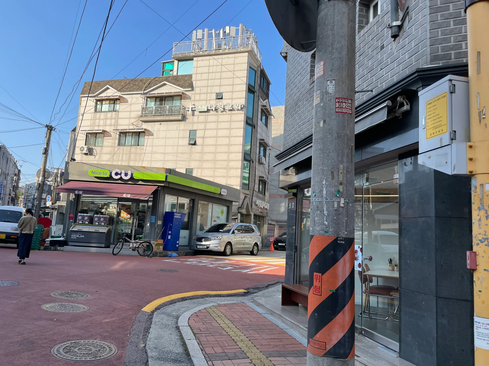 구산동도서관마을가는 교차로의 ‘당김’이라는 카페 외관색은 회색이다.