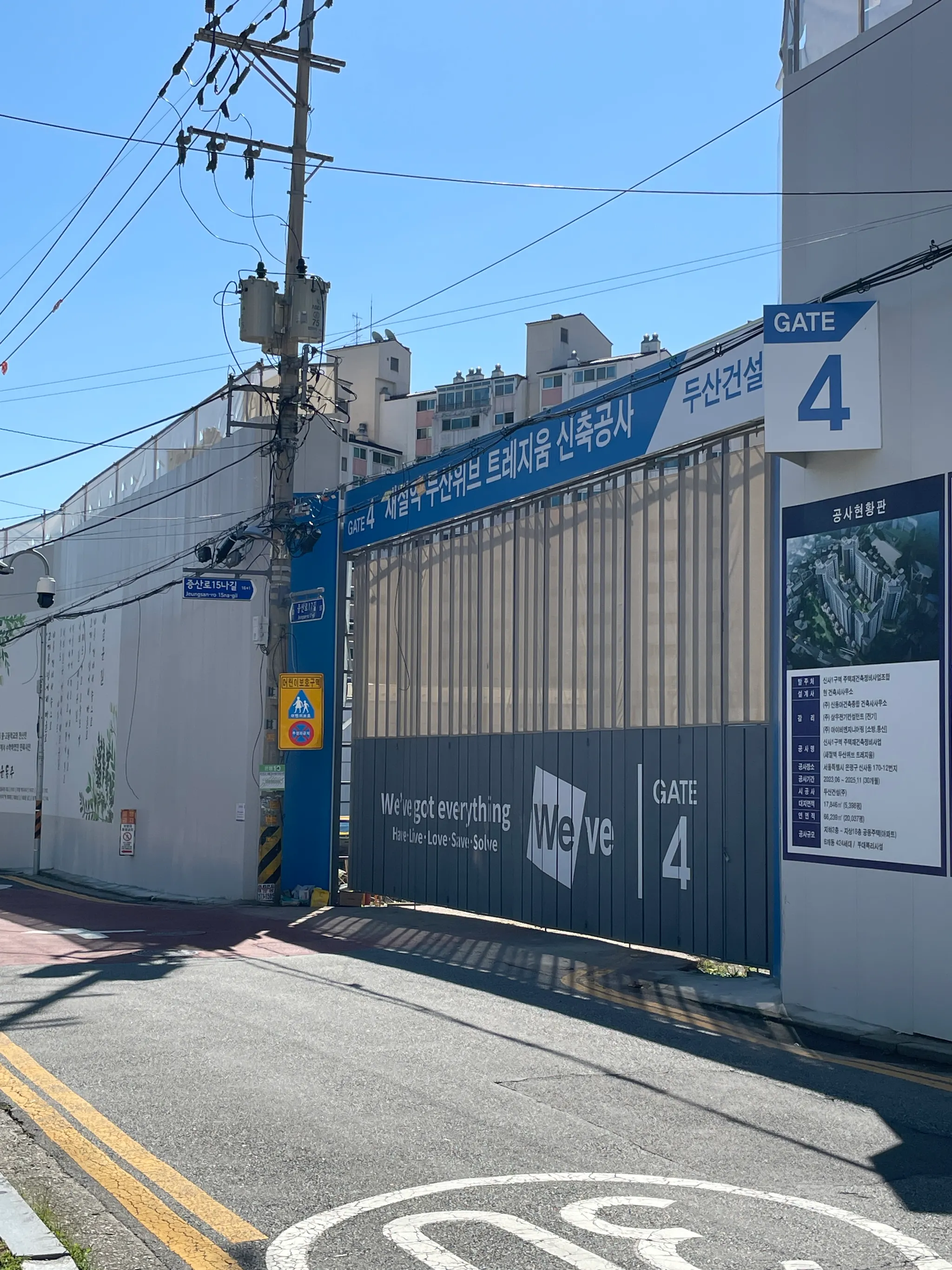 서신초 옆 도로에서 바라 본 두산 아파트 공사현장과 그 주변